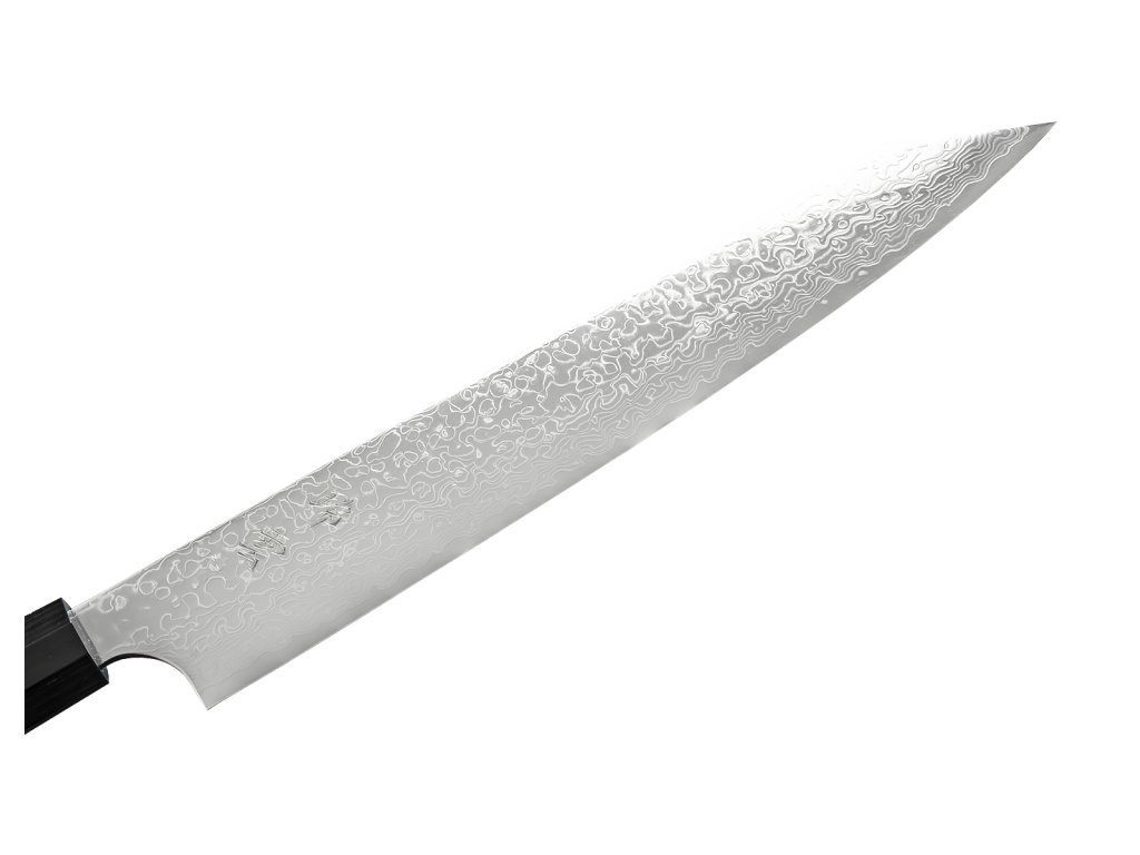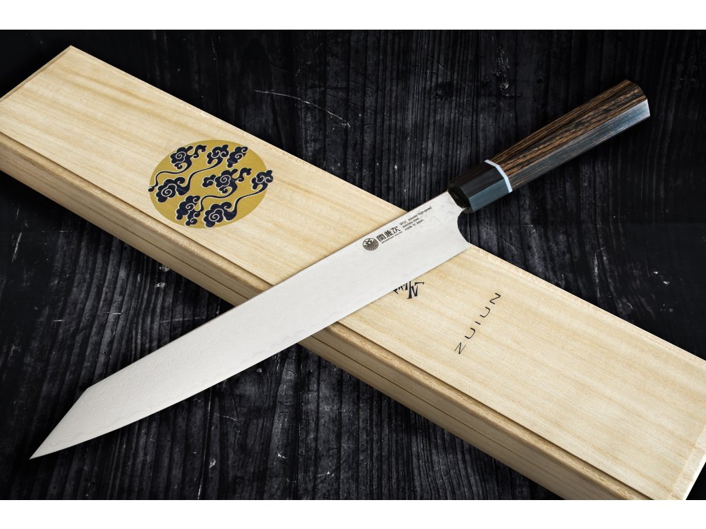 Acest cuțit vă va fermeca prin designul său impresionant și prin cea mai bună calitate a prelucrării și a materialelor utilizate. Seria Zuiun este „nava amiral” a producătorului, această ediție specială a fost fabricată în onoarea centenarului companiei Kanetsugu. Cuțit extrem de ascuțit din oțel de Damasc Seki Kanetsugu Zuiun Sujihiki cu lungimea lamei de 24 cm din oțel pulbere SPG2 de bună calitate. Cuțitul japonez Sujihiki este ideal pentru tăierea feliilor mai subțiri. Îl veți folosi nu numai pentru tăierea brânzeturilor și a cărnii, ci și pentru prepararea unor feluri de mâncare precum popularul sushi. Lucrul cu acest cuțit este rapid, simplu și precis. Vârful lamei este modelat după un model de sabie japoneză, astfel încât îl puteți folosi și pentru prepararea unor delicioase specialități.
