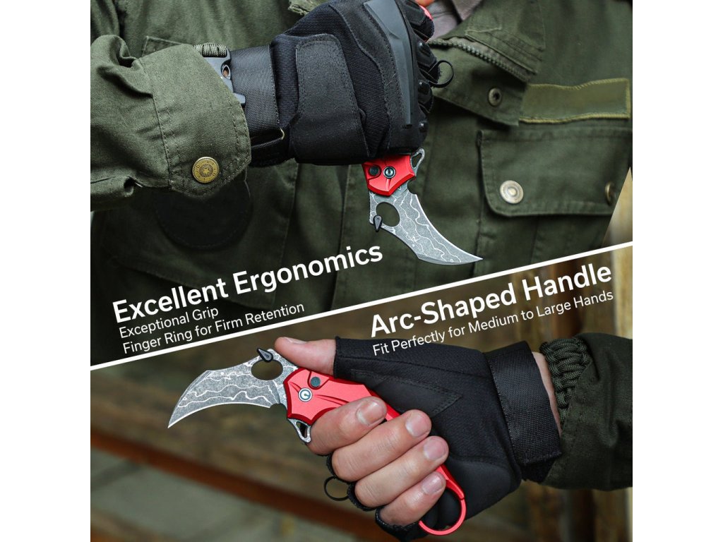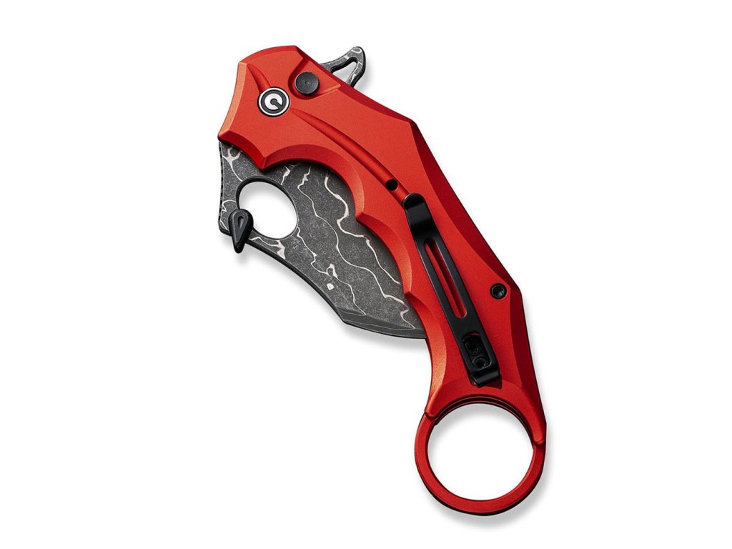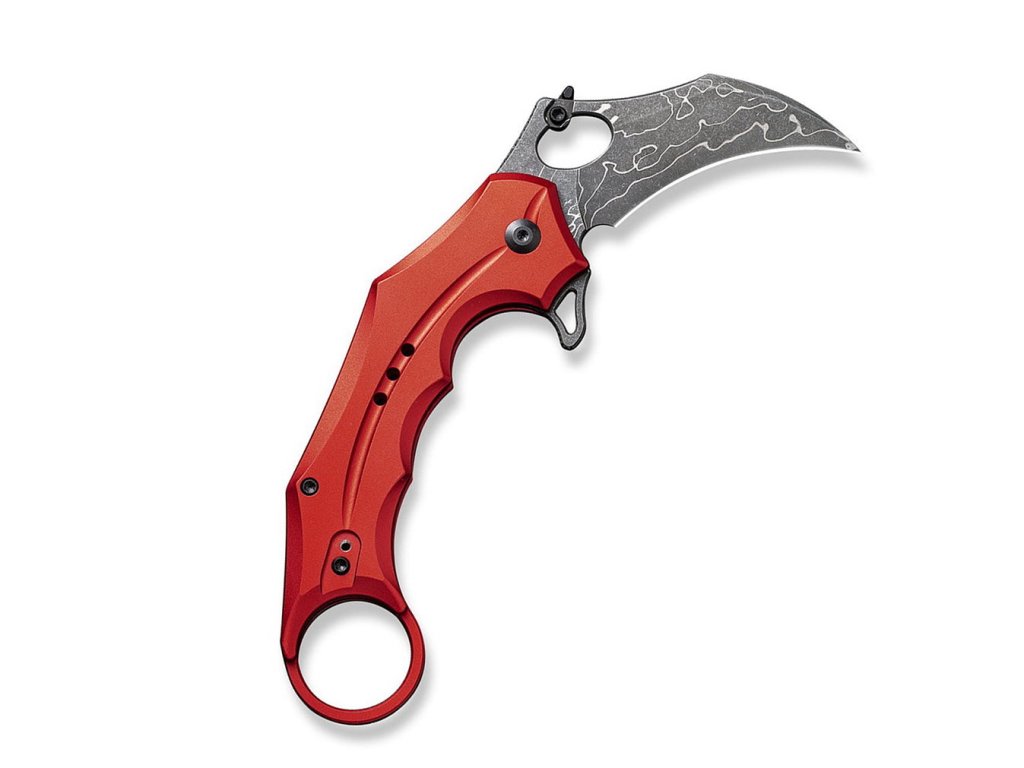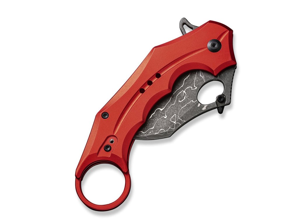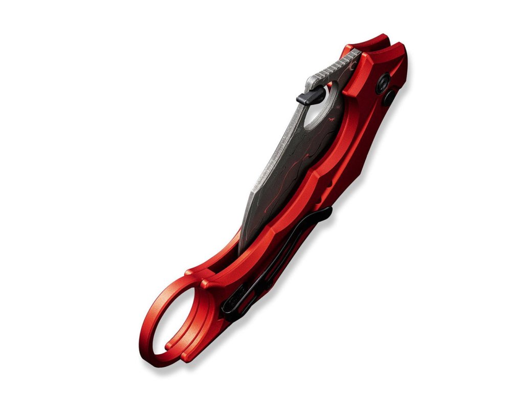 Mânerul este fabricat din aluminiu de culoare roșie strălucitoare. Lungimea acestuia este de 12,5 cm. Mânerul include și o clemă Tip-Up din oțel inoxidabil. Greutatea acestui cuțit Karambit pliabil este de 93 g.