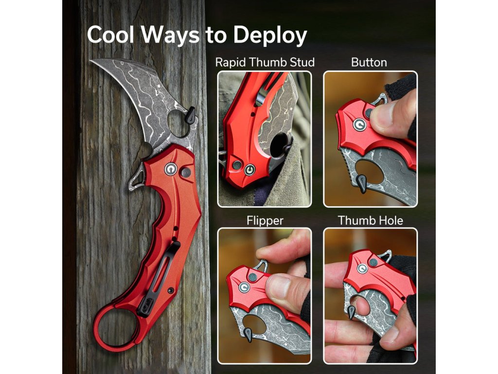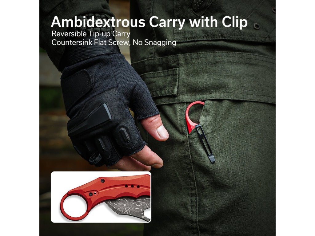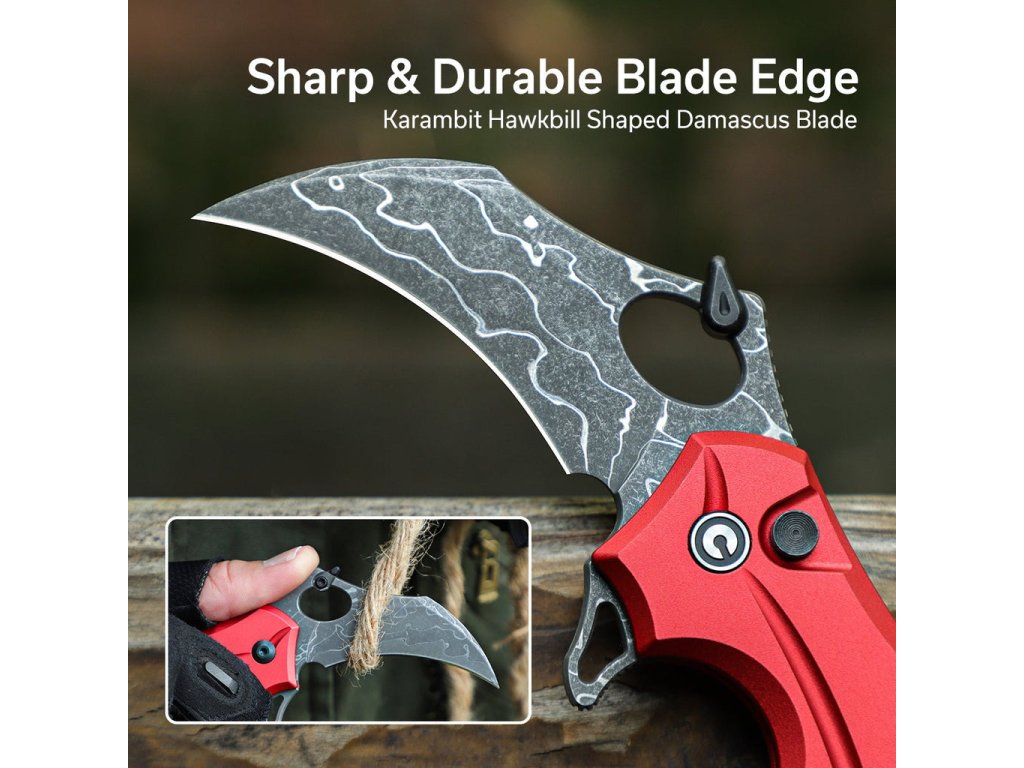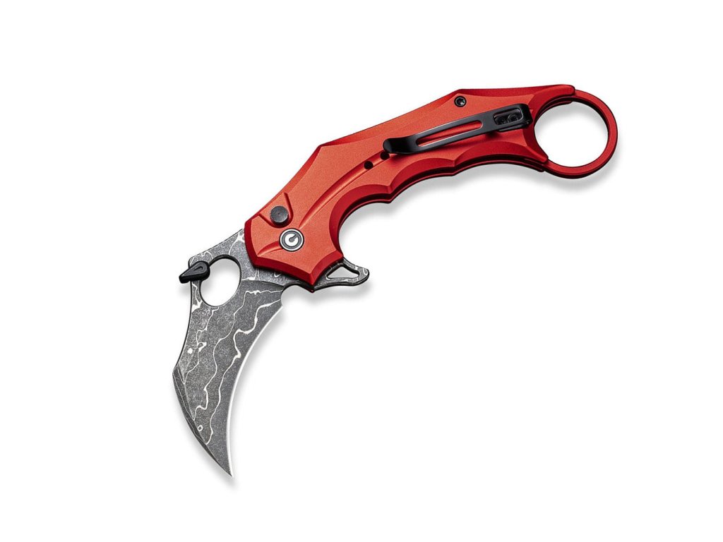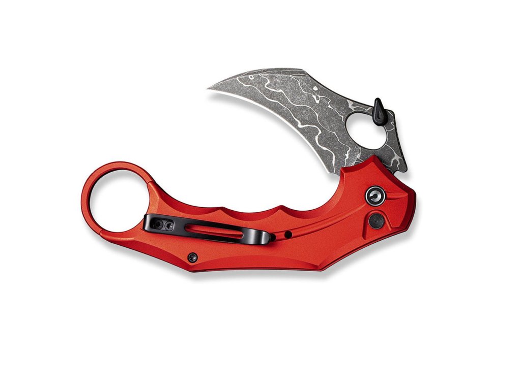 Mânerul este fabricat din aluminiu de culoare roșie strălucitoare. Lungimea acestuia este de 12,5 cm. Mânerul include și o clemă Tip-Up din oțel inoxidabil. Greutatea acestui cuțit Karambit pliabil este de 93 g.