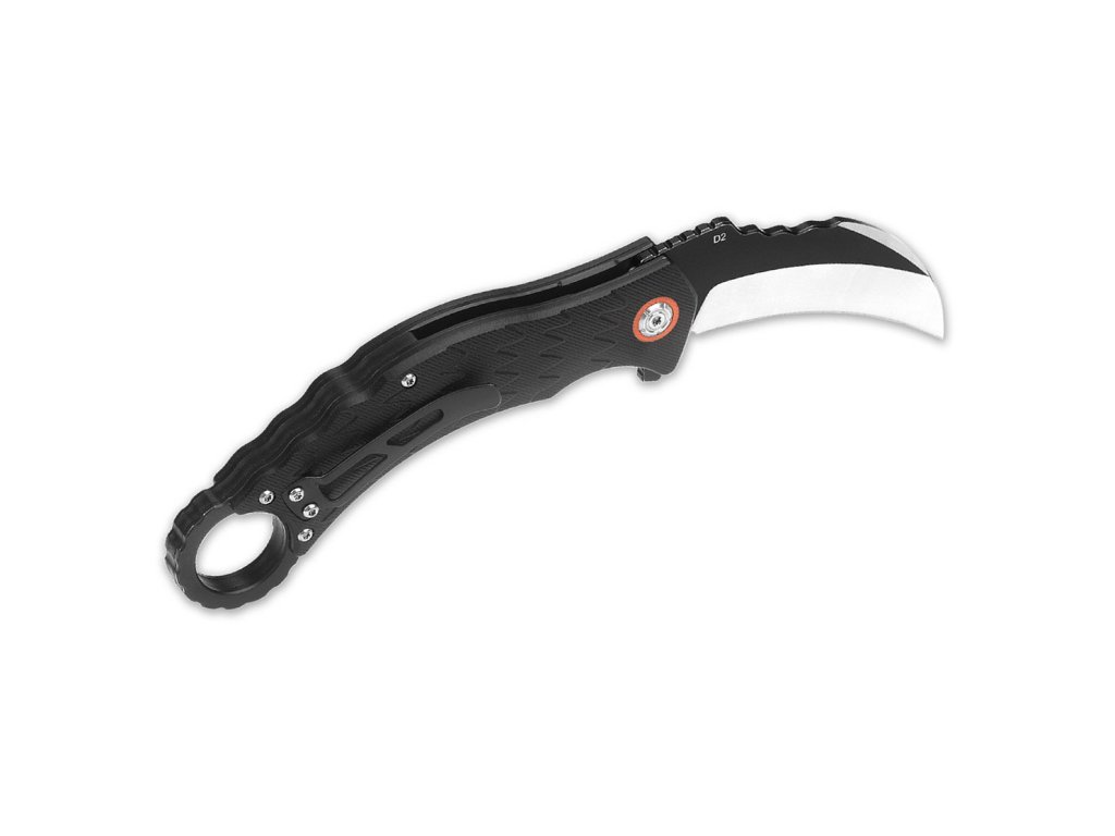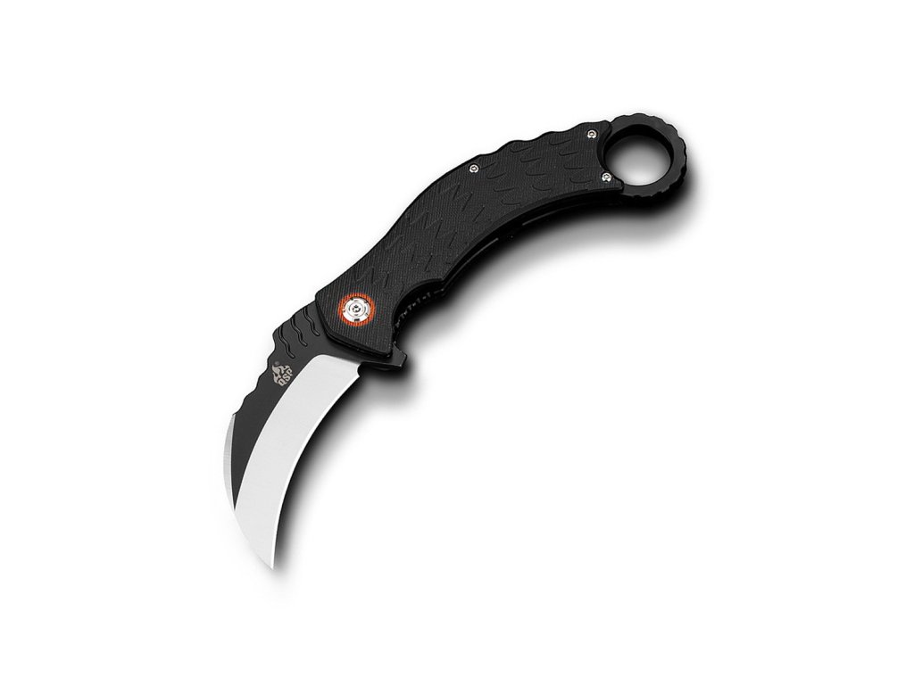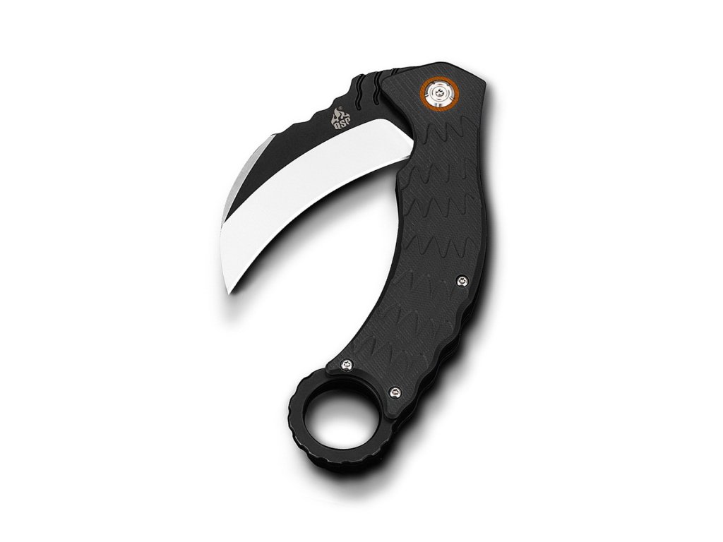 Cuțit pliabil karambit QSP Eagle este un cuțit de încredere fabricat din materiale de calitate. Lama este fabricată din oțel pentru unelte D2. Lama cu grosimea de 3,2 mm are un finisaj satinat și un tăiș flat grind. Lama este montată pe rulmenți ceramici. Mânerul este fabricat din G10, negru. Cuțitul este echipat cu un sistem de blocare a lamei tip liner lock și o clemă din oțel pentru agățare. Deschidere tip flipper.