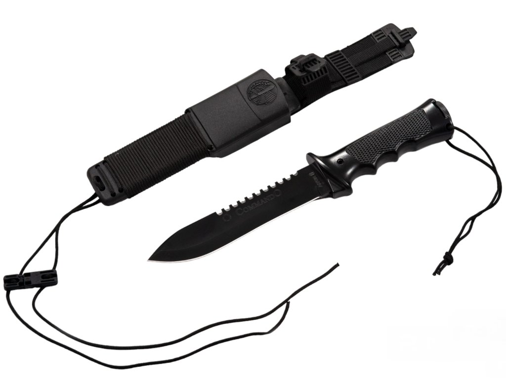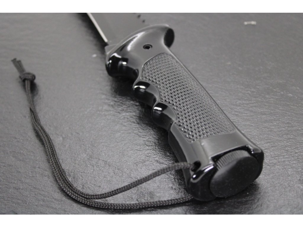 Mânerele cuțitelor Rambo sunt, în general, proiectate cu atenție pentru confort și aderență. Acestea sunt fabricate din materiale durabile, cum ar fi cauciuc, metal sau materiale compozite sintetice și asigură o prindere sigură chiar și în medii umede sau dificile. Designul ergonomic asigură o senzație de echilibru și naturalitate atunci când țineți cuțitului în mână, permițând o manipulare precisă și controlată. Acest cuțit este căutat și folosit de multe forțe de ordine din întreaga lume. Cuțitul este livrat împreună cu o teacă neagră din plastic.