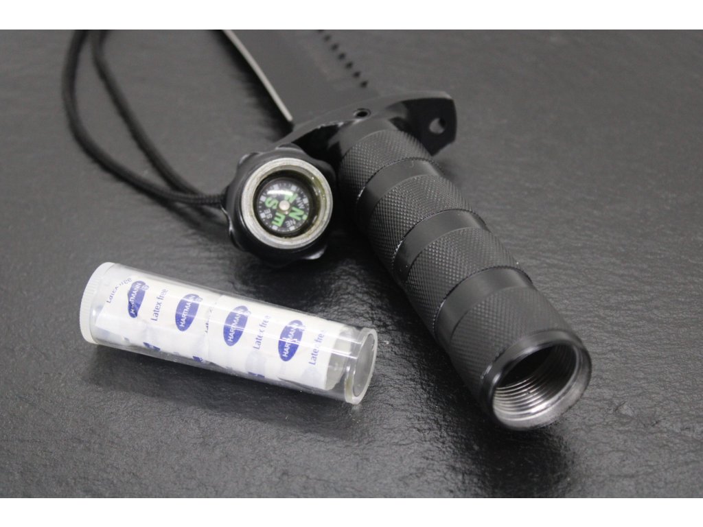 Cuțitul include o mini trusă de supraviețuire ascunsă în mâner și în teacă. Capacul metalic al mânerului este detașabil, sub care se ascunde un compartiment impermeabil, la îndemână pentru a depozita obiecte mici sau accesorii pentru supraviețuire.