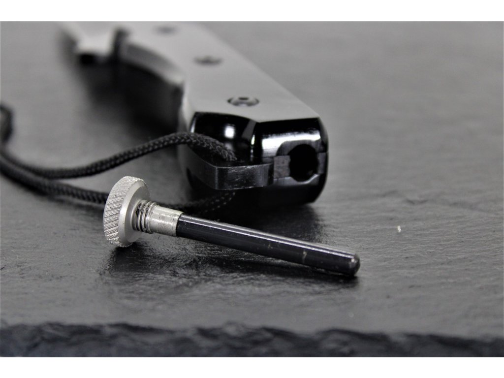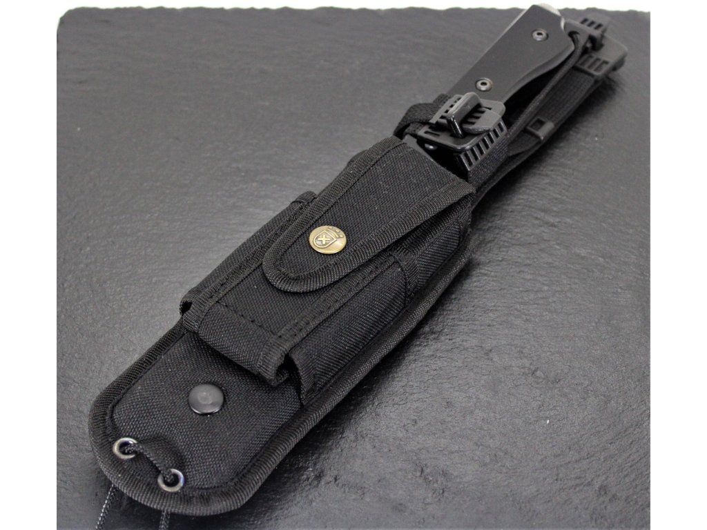 Mânerele cuțitelor pentru supraviețuire sunt, în general, proiectate cu atenție pentru confort și aderență. Acestea sunt realizate din materiale durabile, cum ar fi cauciuc, metal sau materiale compozite sintetice și asigură o prindere sigură chiar și în medii umede sau dificile. Designul ergonomic face ca cuțitul să se simtă echilibrat și natural în mână, permițând o manipulare precisă și controlată. Cuțitul este livrat complet cu o teacă textilă neagră. Partea inferioară a mânerului include o tijă din magneziu, care servește drept kit pentru aprinderea focului.