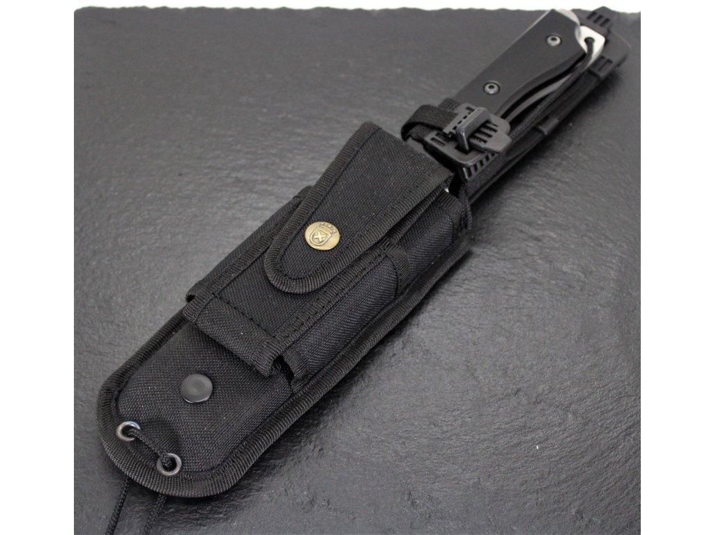 Mânerele cuțitelor pentru supraviețuire sunt, în general, proiectate cu atenție pentru confort și aderență. Acestea sunt realizate din materiale durabile, cum ar fi cauciuc, metal sau materiale compozite sintetice și asigură o prindere sigură chiar și în medii umede sau dificile. Designul ergonomic face ca cuțitul să se simtă echilibrat și natural în mână, permițând o manipulare precisă și controlată. Cuțitul este livrat complet cu o teacă textilă neagră. Partea inferioară a mânerului include o tijă din magneziu, care servește drept kit pentru aprinderea focului.