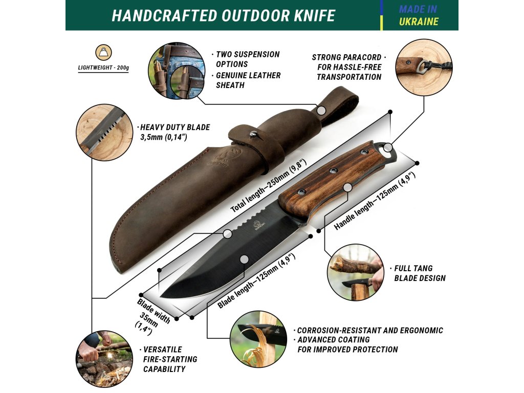Lama, în formă de drop point, este fabricată din oțel carbon 1066 de bună calitate, cu o duritate de 58-60 HRC, cu o lungime de 12,5 cm, o lățime de 3,5 cm și o grosime de 3,5 mm. Mânerul este din lemn de nuc european, de culoare maro închis. Lungimea mânerului este de 12,5 cm. Lungimea totală a cuțitului este de 25 cm. Cuțitul este livrat cu o coardă din paracord și o teacă din piele naturală.