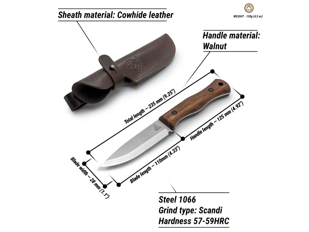 Mânerul din lemn de nuc are un aspect foarte elegant și este confortabil de ținut în mână. La capătul mânerului există o gaură pentru șnur. Teacă este din piele naturală de vită.