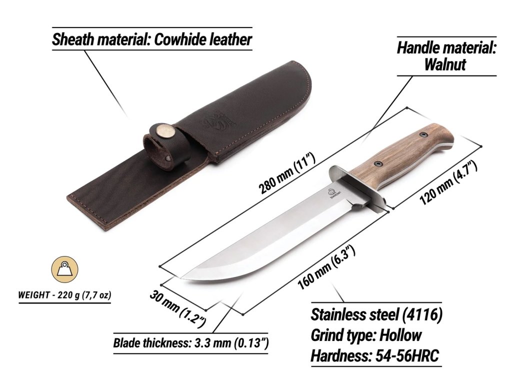 Lama este fabricată din oțel inoxidabil german X50CrMoV15 de bună calitate, care se remarcă în special prin rezistența la coroziune și ascuțirea ușoară. Din punct de vedere al construcției cuțitului este unul mare, lungimea lamei este de 16 cm, iar lungimea totală de până la 28 cm. Grosimea lamei este de 3,3 mm. Mânerul din lemn de nuc cu formă ergonomică oferă o prindere confortabilă și sigură. Mânerul este fixat cu șuruburi din metal și poate fi demontat cu ușurință în cazul operațiilor de întreținere.