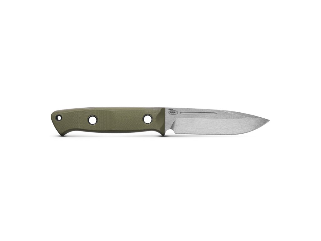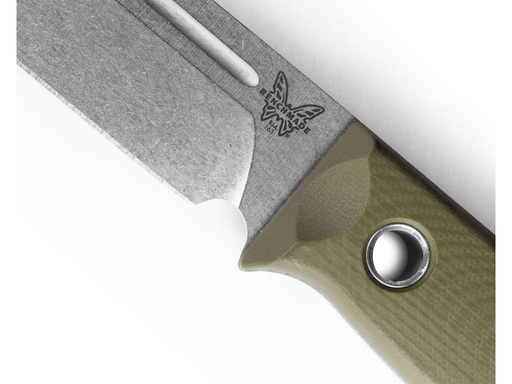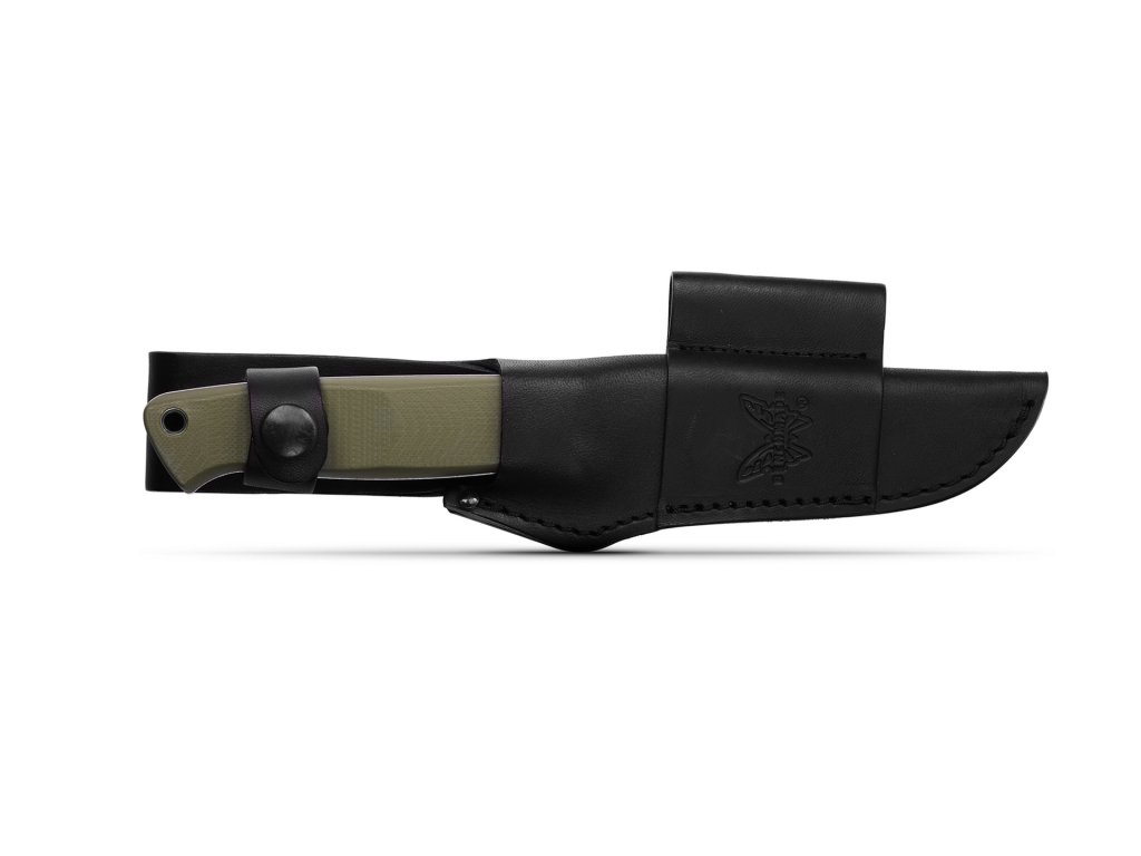Mânerul G10 verde are un orificiu pentru șnur și două nituri distinctive care servesc la ușurarea și echilibrarea mai bună a cuțitului. Teacă din piele cu clemă pentru curea și suport pentru kit pentru aprinderea focului. Cuțitul este fabricat în SUA.