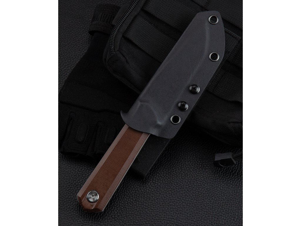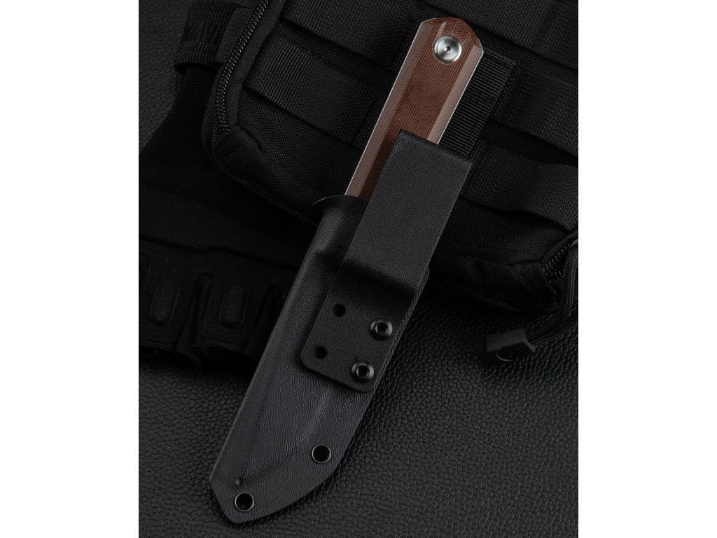 Hedron de la Bestech Knives este un cuțit universal cu lamă fixă, cu teacă din kydex și construcție full tang. Lama cu formă drop point din oțel pentru unelte D2, cu tăiș flat grind și finisaj stonewash are o lungime de 9,6 cm. Mânerul este fabricat din micarta de culoare maro. Cuțitul este livrat cu o teacă din kydex.