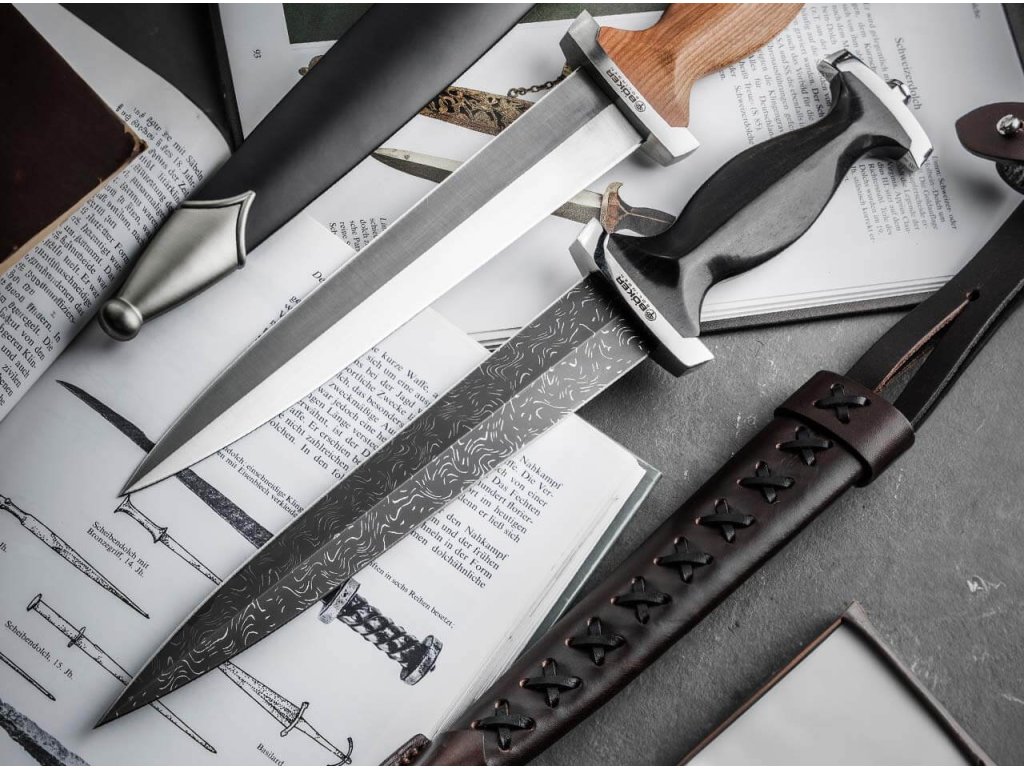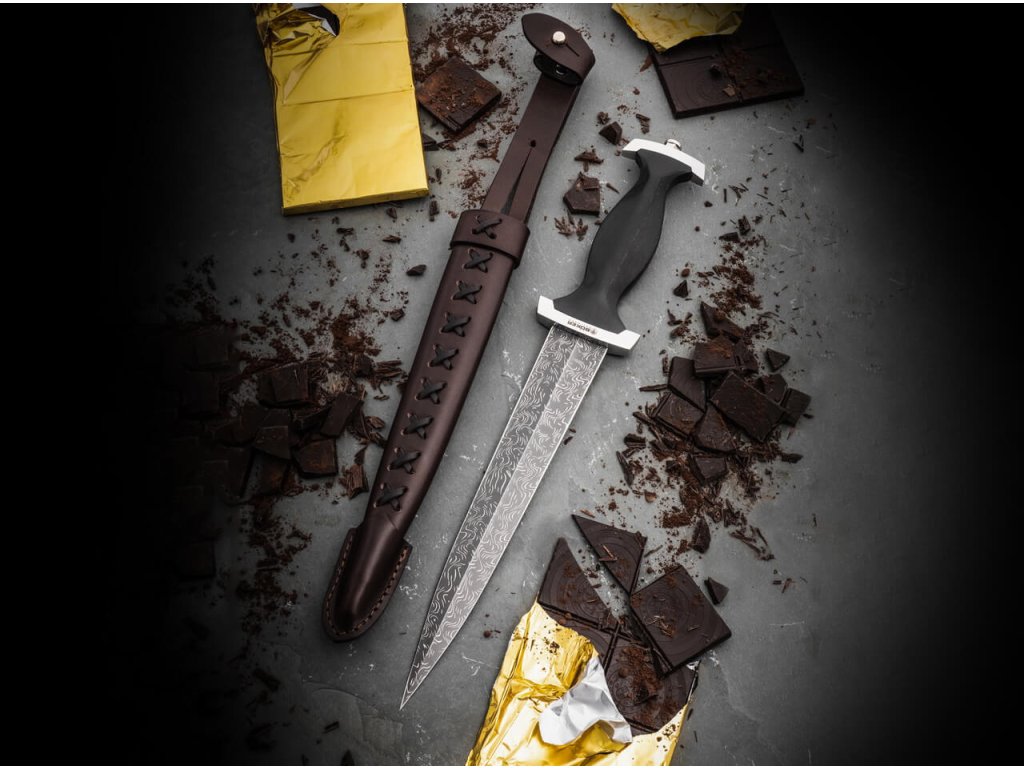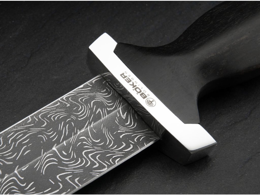 Lama este fabricată din oțel de damasc mozaic, a cărui producție este complexă. Aparține clasei regale a oțelurilor de damasc și face din acest pumnal impresionant o piesă de excepție pentru orice colecție. Spre deosebire de damascul obișnuit, producția damascului mozaic nu se face din straturi. În schimb, tijele din oțel de damasc sunt forjate manual în mozaic într-un proces complex și extrem de complicat. Un mănunchi de oțel de damasc, care inițial este format din straturi intercalate, este tăiat și reasamblat pas cu pas pentru a crea un model unic de mozaic pe suprafețele finale ale tijei. Acesta este apoi tăiat din nou și procesul complex este repetat de mai multe ori, modelul rezultat devenind mai fin și unic. În cele din urmă, mănunchiurile individuale sunt pliațe și forjațe într-o formă pătrată, astfel încât capetele fiecărei piese să formeze o nouă suprafață. Temperatura de forjare, formarea, viteza de deformare și etapele anterioare trebuie să fie coordonate în mod optim. Acest proces de forjare extrem de solicitant, pe care puțini fierari îl stăpânesc, este executat perfect de Chad Nichols pentru pumnalul Böker.
