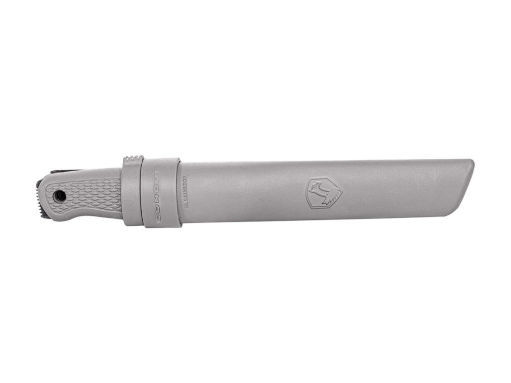 Cuțit cu lama fixă cu lungimea de 9,9 cm, fabricat din oțel carbon 1095. Mâner din polimer gri. Pachetul include o teacă simplă din plastic.