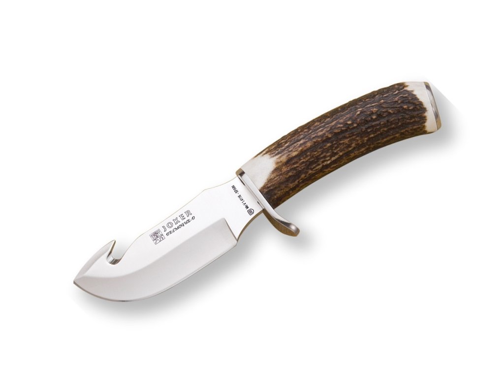 Cuțit de vânătoare Joker Desmogue-D CC28 cu lamă skinner, fabricată din oțel X50CrMoV15 (1.4116). Acest cuțit de dimensiuni medii, pentru activități în aer liber are mânerul fabricat din corn de cerb. Lama de lungime 11 cm are un finisaj satinat. Lama skinner face din acest cuțit o piesă unică, care se va potrivi perfect în colecția oricărui pasionat de activități în aer liber. Lama este concepută pentru a îndepărta pielea vânatului. Cârligul de eviscerare este utilizat de obicei pentru a facilita extragerea organelor interne. Pachetul include o teacă din piele maro de calitate superioară. Cuțitul este fabricat în întregime în Spania.