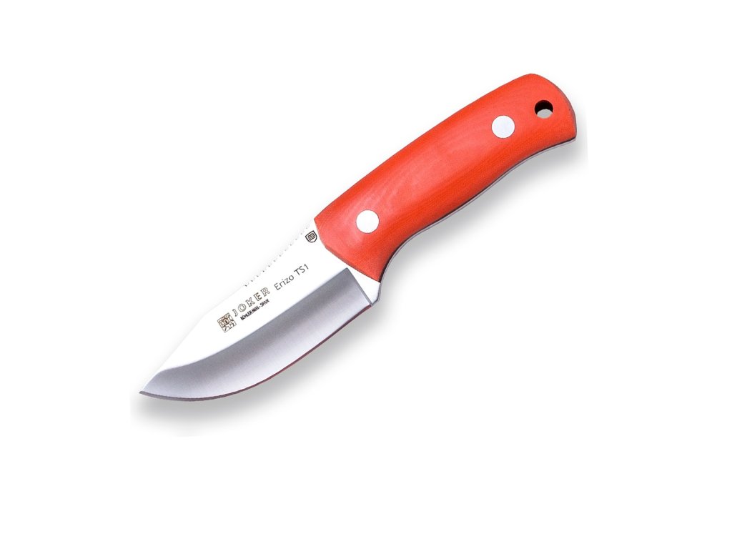 Joker Erizo TS1 CN81 este un cuțit cu lamă fixă mai mic, conceput pentru a fi purtat la gât sau agățat la curea. Lama, de 7,5 cm lungime, este fabricată din oțel inoxidabil Böhler N695 și are un tăiș scandi. Mânerul din micarta de culoare portocalie este o adevărată bijuterie pentru acest cuțit. Pachetul include o teacă din piele. Cuțitul este fabricat în întregime în Spania.