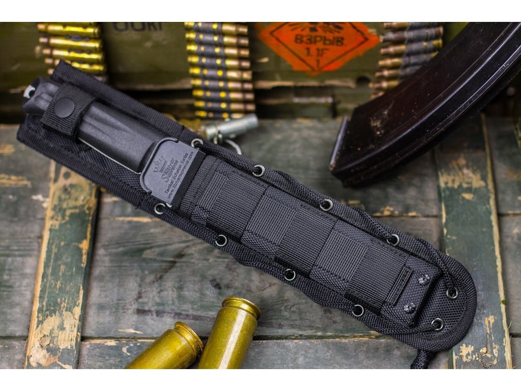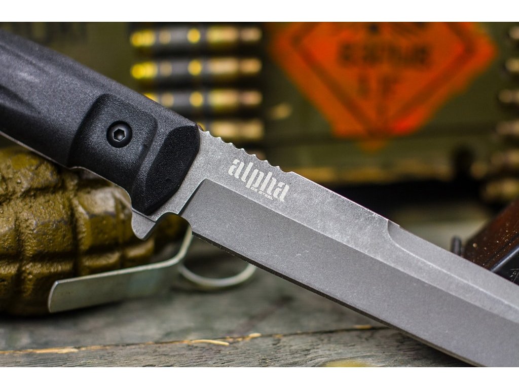 Model modern de cuțit de luptă din seria Echelon. Construcția cuțitului full tang îi asigură rezistența și fiabilitatea. Lamă realizată din oțel AUS-8, duritate 57-59 HRC, cu un tăiș fals pe marginea superioară a lamei și cu un finisaj TacWash (gri stonewash). Mâner realizat din două straturi: stratul inferior este din plastic ABS, care asigură rezistența mânerului., stratul superior al mânerului realizat din Kraton, care este plăcut la atingere și în același timp foarte rezistent. Cuțitul este livrat cu o teacă din nailon-plastic compatibilă cu sistemul Molle.