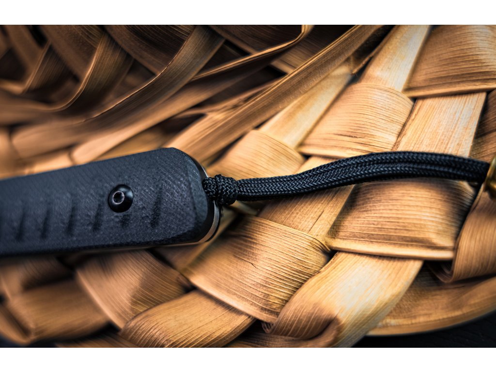 Mâner negru din G10 cu un model interesant „diamant”. La capătul mânerului există o gaură ascunsă pentru șnur (vizibilă numai când este privită din spate). Teacă din Kydex. Șnurul și adaptoarele nu sunt incluse.