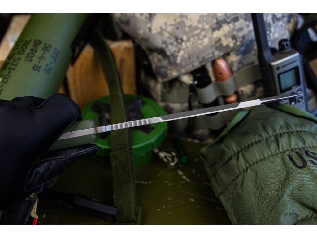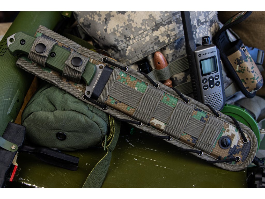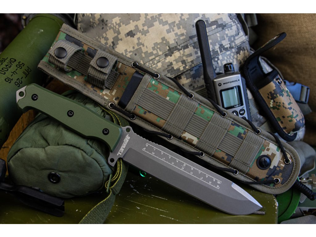 Mânerul verde-măsliniu din G10 are o formă confortabilă și nu vă rănește mâna chiar și în timpul lucrărilor solicitante. Cuțitul este livrat cu o teacă MOLLE din plastic, care vă permite să agățați cuțitul practic oriunde. Teaca poate fi, de asemenea, agățată cu ușurință cu agățătoare de curea, fără a fi nevoie să o desfaceți.