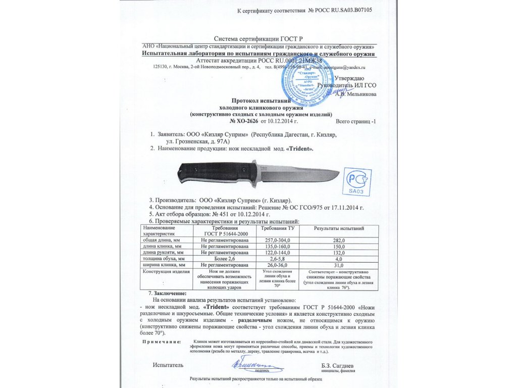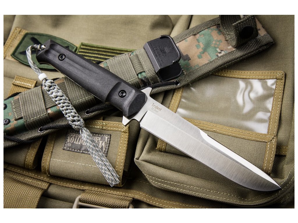 Kizlyar Supreme Trident este un cuțit tactic modern din seria Echelon. Construcția full tang a cuțitului îi asigură rezistența și fiabilitatea. Lama este fabricată din oțel D2, duritate 60-62 HRC, cu un finisaj fin stonewash. Mâner realizat din două straturi - stratul inferior este din plastic ABS, care asigură rezistența mânerului, stratul superior al mânerului realizat din Kraton, care este plăcut la atingere și în același timp foarte durabil. Cuțitul este livrat cu o teacă din nailon compatibilă cu sistemul Molle.
