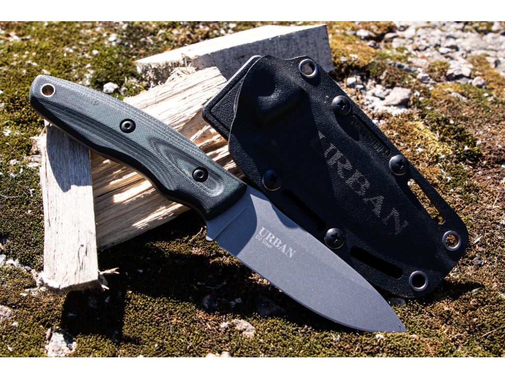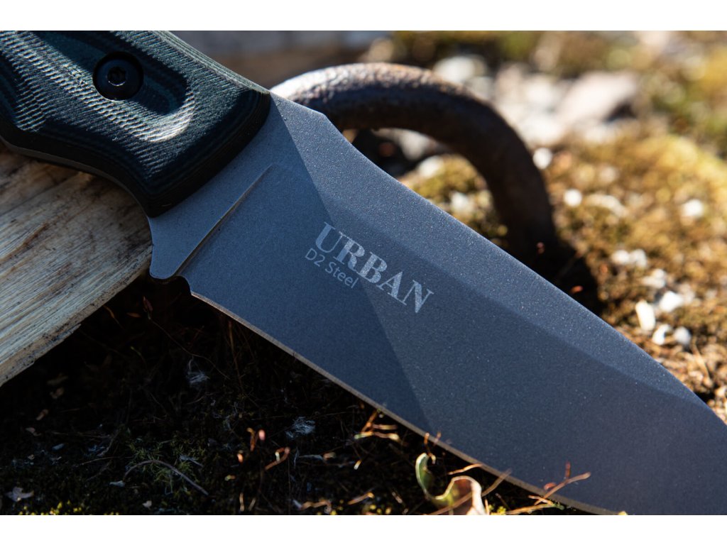 Cuțit pentru activități în aer liber, mai mic, universal. Construcția full tang asigură rezistența și fiabilitatea sa. Lama fabricată din oțel D2, duritate 60-62 HRC, cu finisaj tac wash, are o formă drop point și un tăiș flat grind. Mâner din G10, negru-verde. Teacă din Kydex.