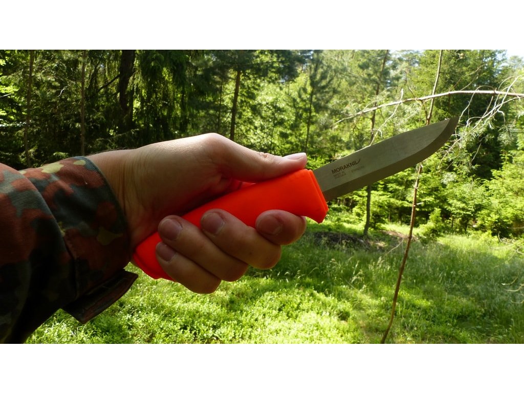 Cuțitele Bushcraft sunt cunoscute pentru ergonomia și caracterul lor practic deosebite. Lamă din oțelul inoxidabil Sandvik 12C27, cu o grosime de 3,2 mm. Oțelul se remarcă prin rezistența excelentă la rugină și rezistența ridicată la uzură. Mânerul din plastic cu formă ergonomică, cauciucat se potrivește bine în mână și nu alunecă nici în cazul unei mâini ude. Cuțitul este livrat cu un teacă din plastic de culoare portocalie care include o suprafață pentru ascuțit diamantată, o clemă pentru prinderea la curea și un kit pentru aprinderea focului.