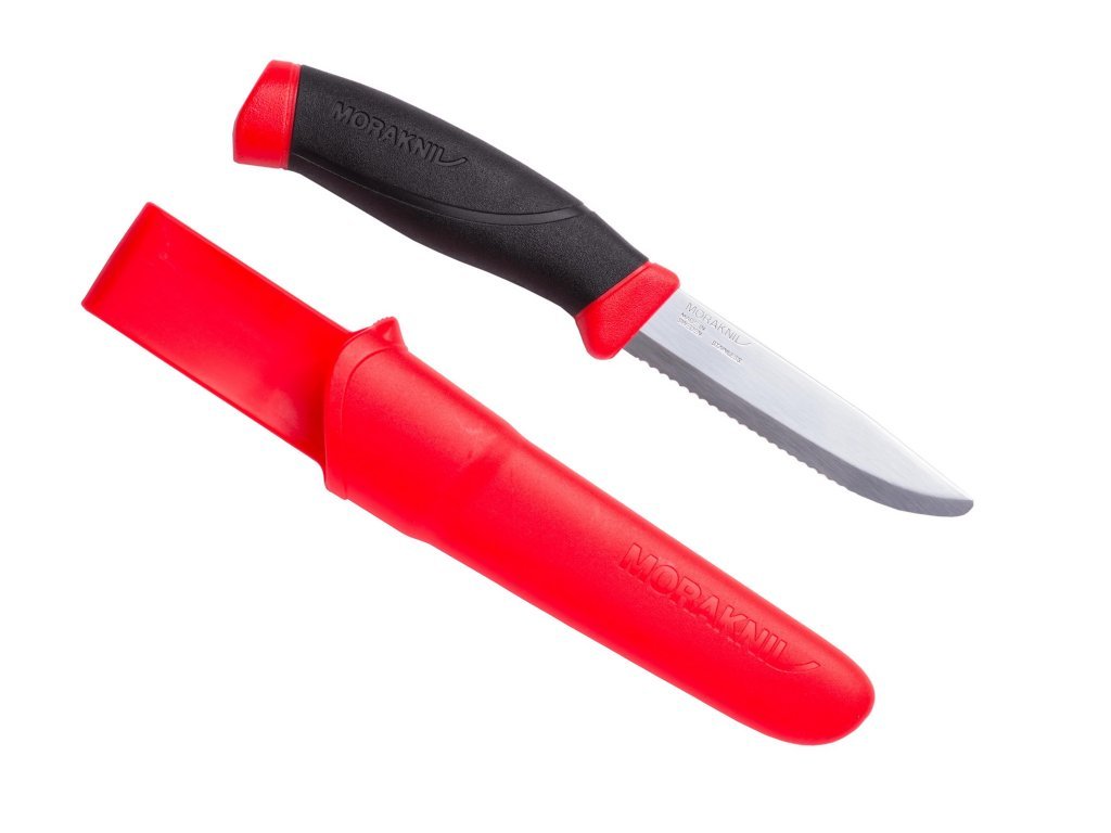 Cuțit special pentru salvare cu lamă zimțată, cu vârf care crește siguranța utilizării într-o situație de criză. Morakniv Companion Hi-Vis Rescue are lamă din oțel inoxidabil Sandvik 12C27, duritate 57-58 HRC, cu tăiș zimțat. Mânerul din plastic este de culoare negru-portocaliu, cu un finisaj anti-alunecare, din cauciuc TPE durabil. Teaca din plastic se atașează cu ușurință la curea, fără a fi necesară desfacerea acesteia. Culoarea mânerului și a tecii este foarte distinctivă pentru a face cuțitul ușor de găsit chiar și în condiții de lumină slabă. Cuțitul este fabricat de Suedia.