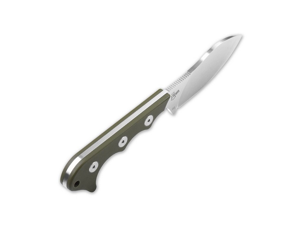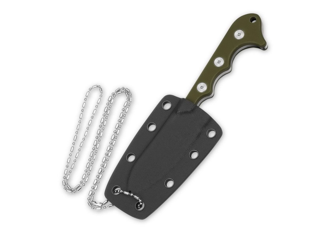 Cuțit cu lama fixă, potrivit și pentru purtare la gât. QSP Neckmuk combină forma clasică a lamei nessmuk cu un design modern. Lama este fabricată din oțel pentru unelte D2, are o construcție de tip full-tang, finisaj satinat și tăiș flat grind. Mânerul din G10, verde, este construit astfel încât să se potrivească perfect în mână și să ofere o prindere fermă în orice condiții. Teacă din Kydex.