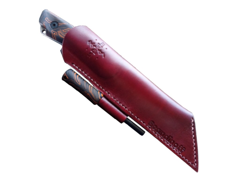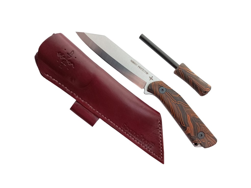 Mâner din G10 cu model colorat Nordic Woods. Teacă din piele ce se poate agăța la curea, realizată din piele de vită premium cu grosimea de 4 mm. Vine cu un instrument pentru generarea scânteilor.