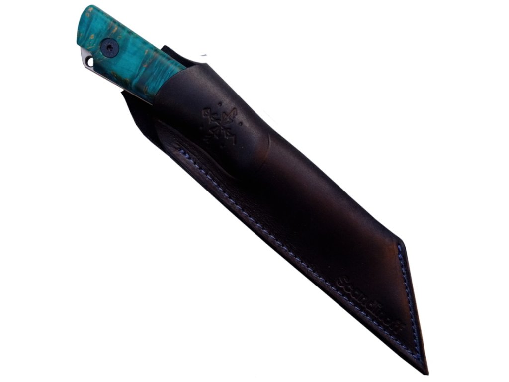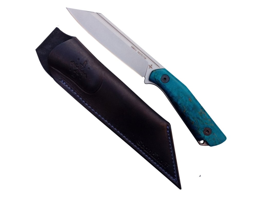 Mâner din lemn de mesteacăn creț stabilizat, de culoare albastră. Mesteacănul creț este utilizat în mod tradițional la fabricarea cuțitelor scandinave. Este popular pentru modelul său frumos, durabilitate și prinderea confortabilă. Uneori este denumit și mesteacăn karelian.