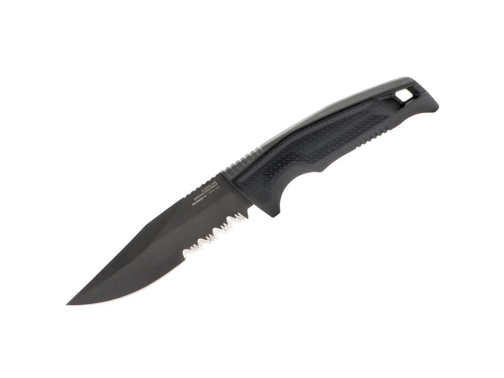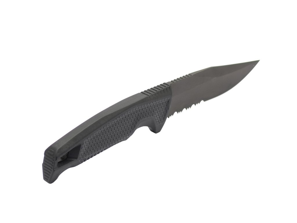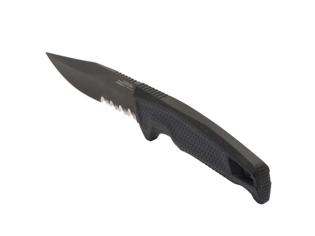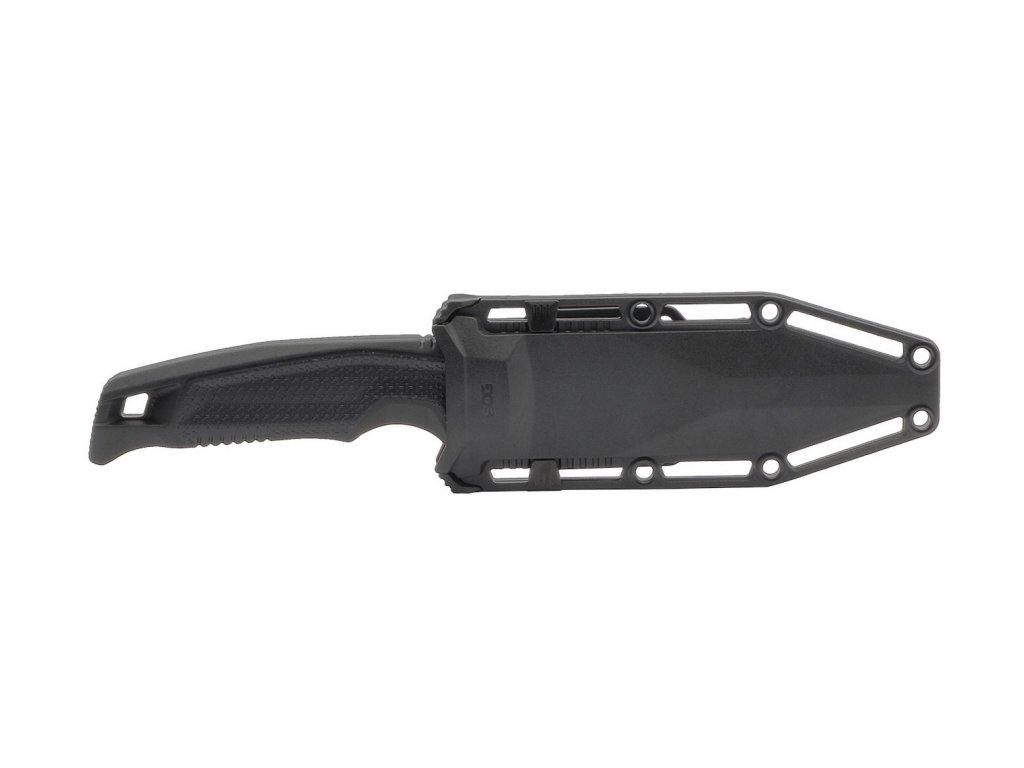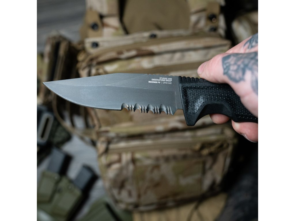 Cuțitul SOG Recondo FX a fost fabricat conform cerințelor utilizatorilor profesioniști în uniformă. Datorită lamei fixe și construcției full tang, Recondo poate fi utilizat ca cuțit de supraviețuire, tactic și outdoor. Lama din oțel inoxidabil CRYO 440C, are lungimea de 11,93 cm și finisaj din nitrură de titan, care include și o parte parțial zimțată, potrivită pentru tăierea frânghiilor. Mânerul negru, cauciucat, permite o prindere optimă în orice mediu și în orice condiții. Cuțitul este livrat cu o teacă neagră din kydex UMS (universal mounting system) de la SOG. Teaca oferă posibilitatea de a alege câtă forță trebuie să fie exercitată pentru a scoate cuțitul și vine cu alte opțiuni pentru a-l regla exact în funcție de activitatea pentru care veți folosi cuțitul.