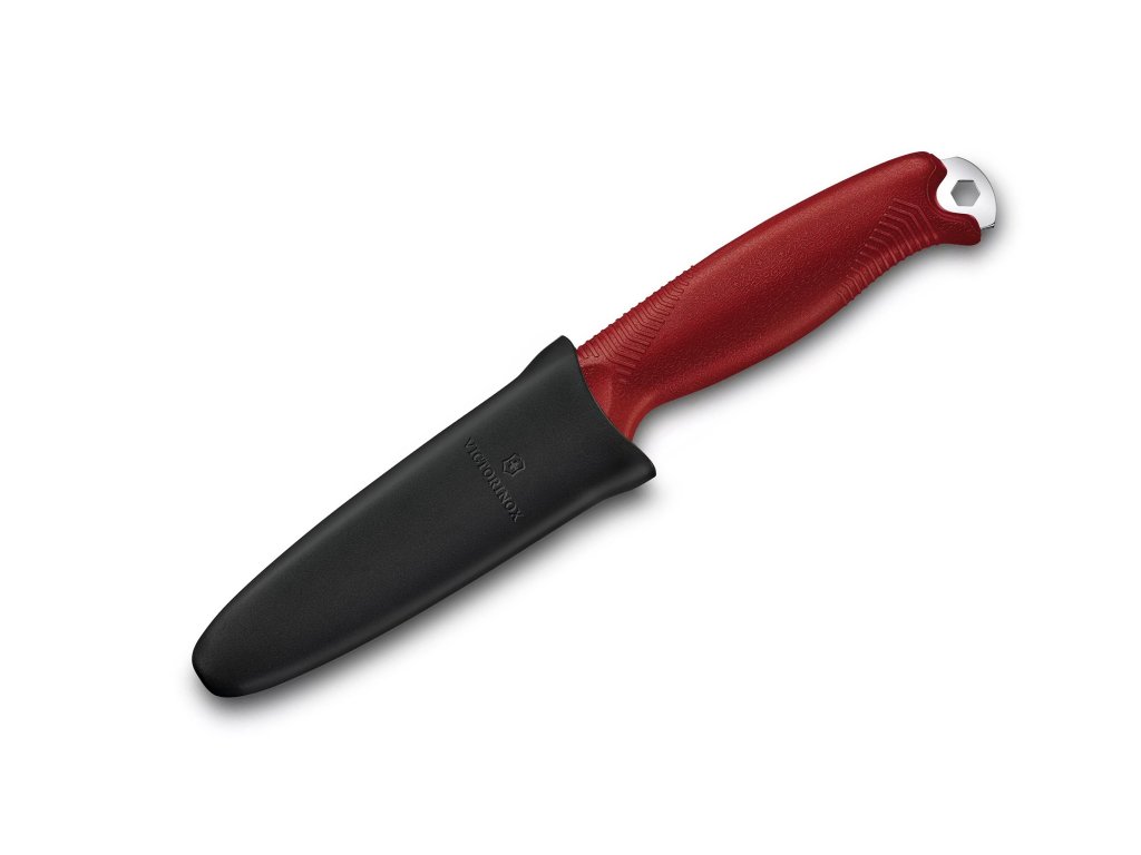 Mâner din polimer termoplastic TPE de culoare roșie cu sigla producătorului Victorinox gravată pe el. Nu va aluneca din mână și este foarte durabil, fiind potrivit pentru toate condițiile. La capătul mânerului, iese în evidență cu o gaură hexagonală distinctă. Îl puteți folosi pentru a răzui scoarța atunci când aprindeți un foc. Această gaură hexagonală este compatibilă cu burghiul plan din Venture Pro Kit. De asemenea, o puteți folosi ca gaură pentru șnur.