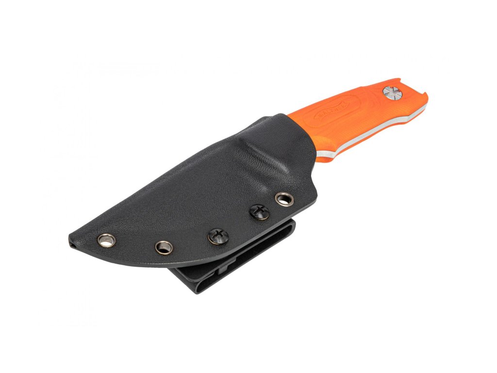 Cuțit pentru vânătoare Walther HBF 1, din oțel D2 și mâner din G10 de culoare portocaliu. Lungimea lamei este de 8,4 cm.