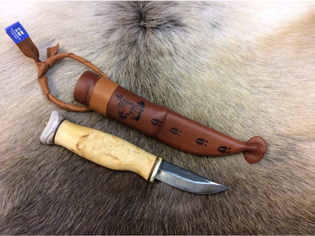 Cuțit tradițional scandinav puukko de dimensiuni mai mici, cu lama fixă, lungă de 6,2 cm, fabricat din oțel carbon. Lama din oțel carbon 80CrV2 are un tăiș tip scandi grind și este foarte ascuțită. Oțelul 80CrV2 se remarcă prin tenacitate, ceea ce îl face ideal pentru utilizarea în natură. Mânerul din lemn de mesteacăn creț este foarte confortabil de ținut în mână datorită formei rotunjite. Cuțitul este livrat cu o teacă din piele.