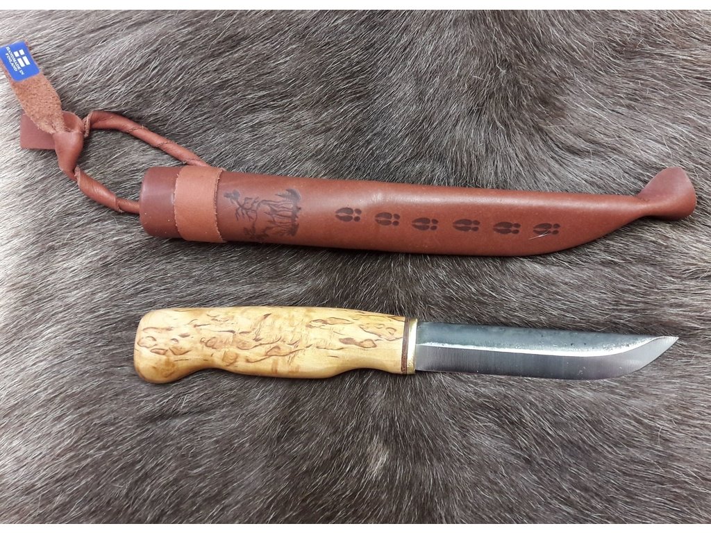 Cuțit tradițional scandinav puukko, cu lama fixă, lungă de 8,5 cm, fabricat din oțel carbon. Lama din oțel carbon 80CrV2 are un tăiș tip scandi grind și este foarte ascuțită. Oțelul 80CrV2 se remarcă prin tenacitate, ceea ce îl face ideal pentru utilizarea în natură. Mânerul din lemn de mesteacăn creț este foarte confortabil de ținut în mână datorită formei rotunjite. Cuțitul este livrat cu o teacă din piele.