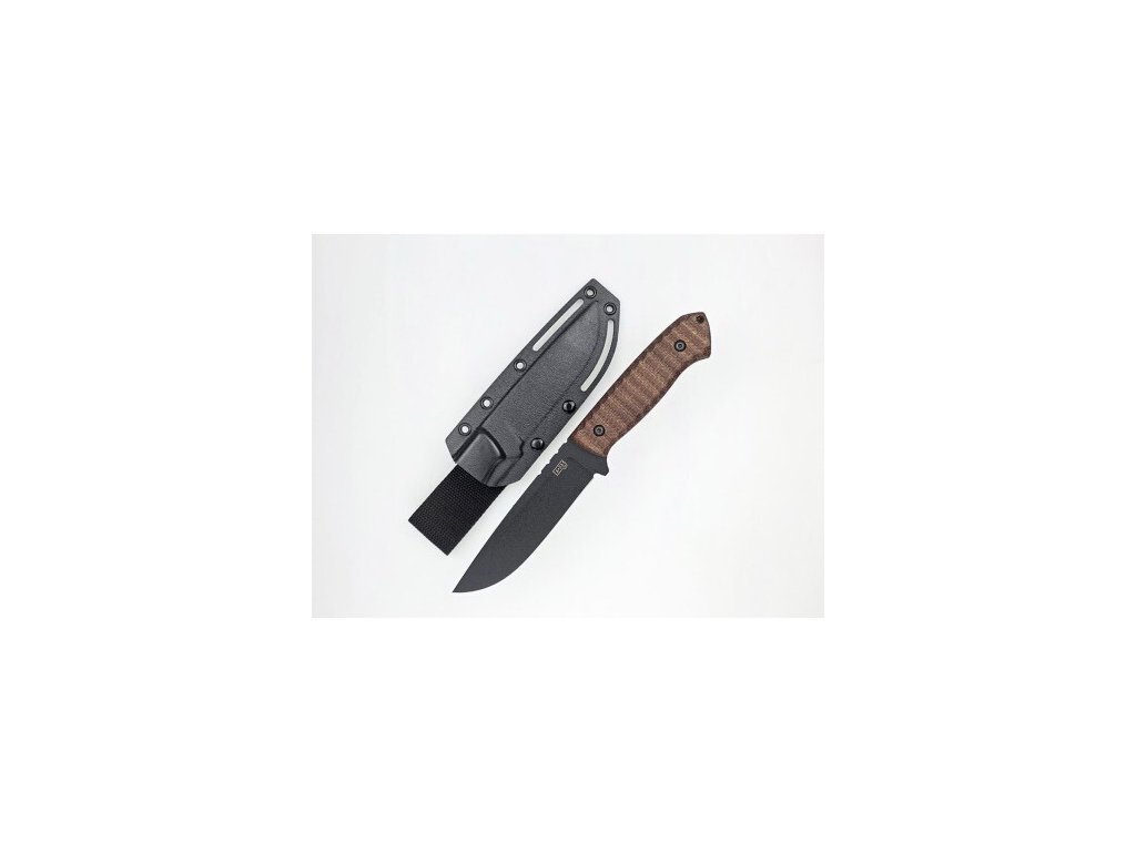 Cuțit pentru exterior fabricat din oțel pentru unelte O2. Lamă Cerakote, lungime 12 cm. Lungime totală 25 cm. Mâner din micarta - maro.