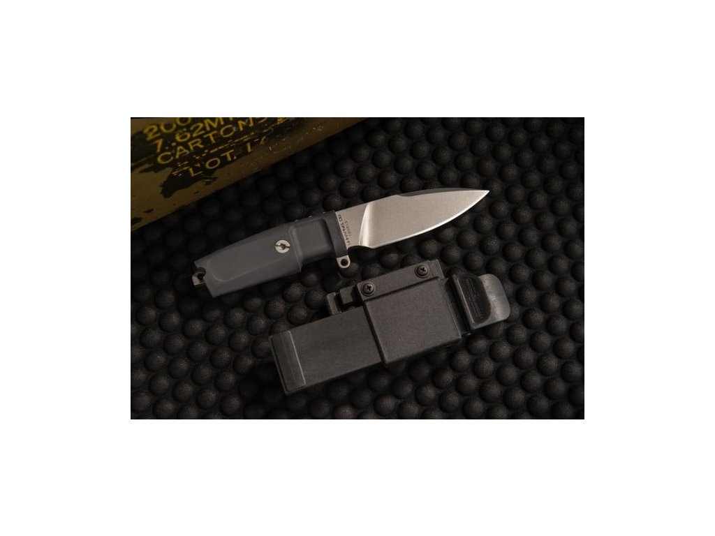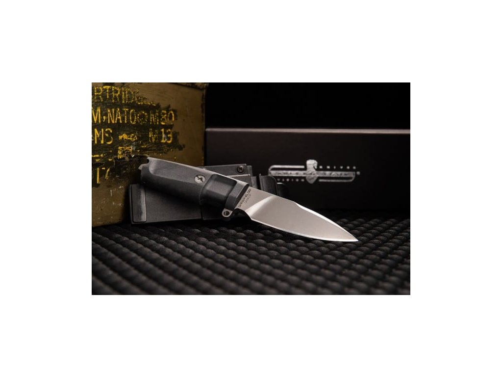 Cuțit tactic fabricat din oțel Böhler N690. Mâner negru din Forprene®. Lungimea lamei: 11 cm. Teacă inclusă.
