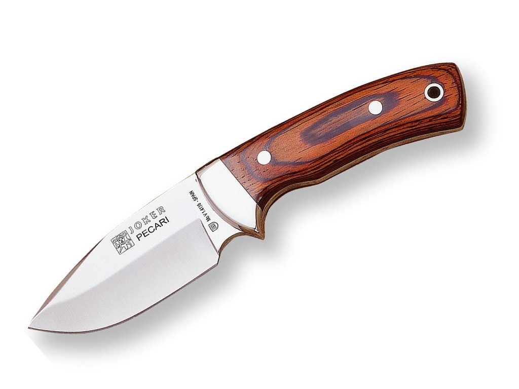 Joker Pecari CR20 este un cuțit mai mic pentru utilizare zilnică în aer liber, potrivit și drept cuțit de vânătoare mai mic. Lama cu formă drop point este fabricată din oțel inoxidabil 1.4116 molibden-vanadiu, are o lungime de 8,5 cm și un finisaj satinat. Mânerul cuțitului, cu o prindere confortabilă, este fabricat din lemn laminat (redwood). Pachetul include o teacă din piele maro de calitate superioară, cu opțiunea de a o atașa la curea. Cuțitul este fabricat în întregime în Spania.