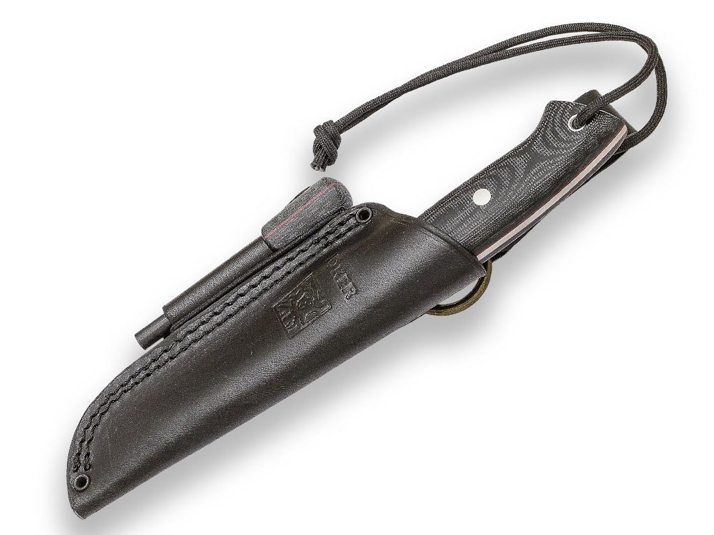 Cuțit Bushcraft cu instrument pentru generarea scânteilor. Lamă din oțel Sandvik 14C28. Lungimea lamei 11 cm, lungime totală 23,5 cm. Mâner din micarta. Teacă din piele.
