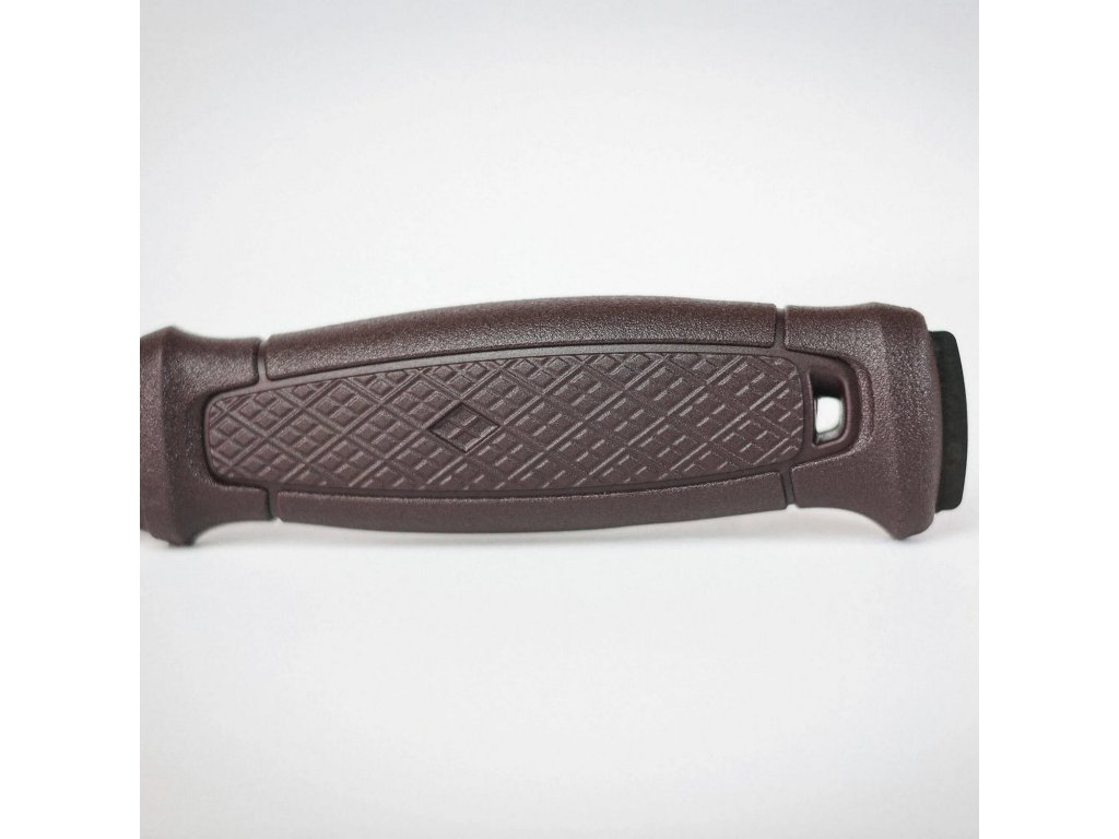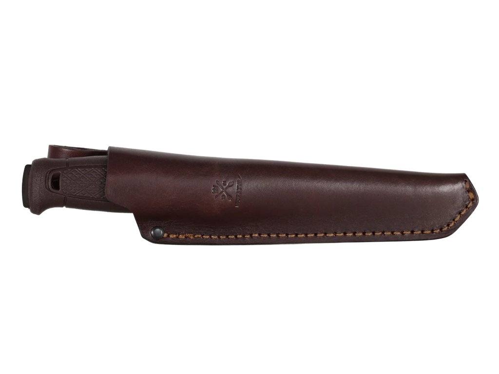Cuțit pentru outdoor. Lamă neagră din oțel carbon C100S. Lungimea lamei 14,2 cm, lungime totală 26,2 cm. Mâner din polimer maro. Teacă din piele.