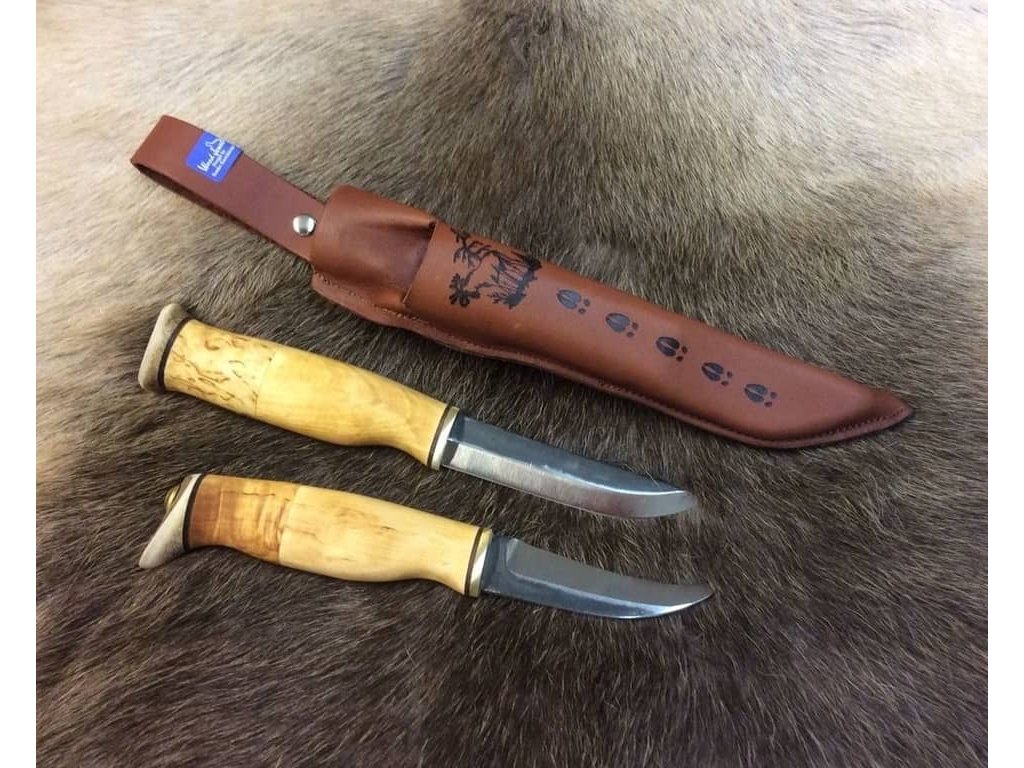 Set de două cuțite finlandeze într-o singură teacă. Se compune din două cuțite scandinave tradiționale - un cuțit universal pentru activități în aer liber și vânătoare cu o lungime a lamei de 9,5 cm și un cuțit special pentru eviscerarea vânatului. Cuțitul pentru eviscerarea vânatului are o lungime a lamei de 7,7 cm și un vârf rotunjit. Forma lamei facilitează eviscerarea vânatului și previne deteriorarea viscerelor. Lamele sunt fabricate din oțel carbon 80CrV2, care excelează prin tenacitate ridicată. Mânerele din mesteacăn creț și corn de ren au o formă ergonomică și sunt confortabile în mână. Aceste cuțite vin într-o teacă din piele care oferă spațiu pentru ambele cuțite.