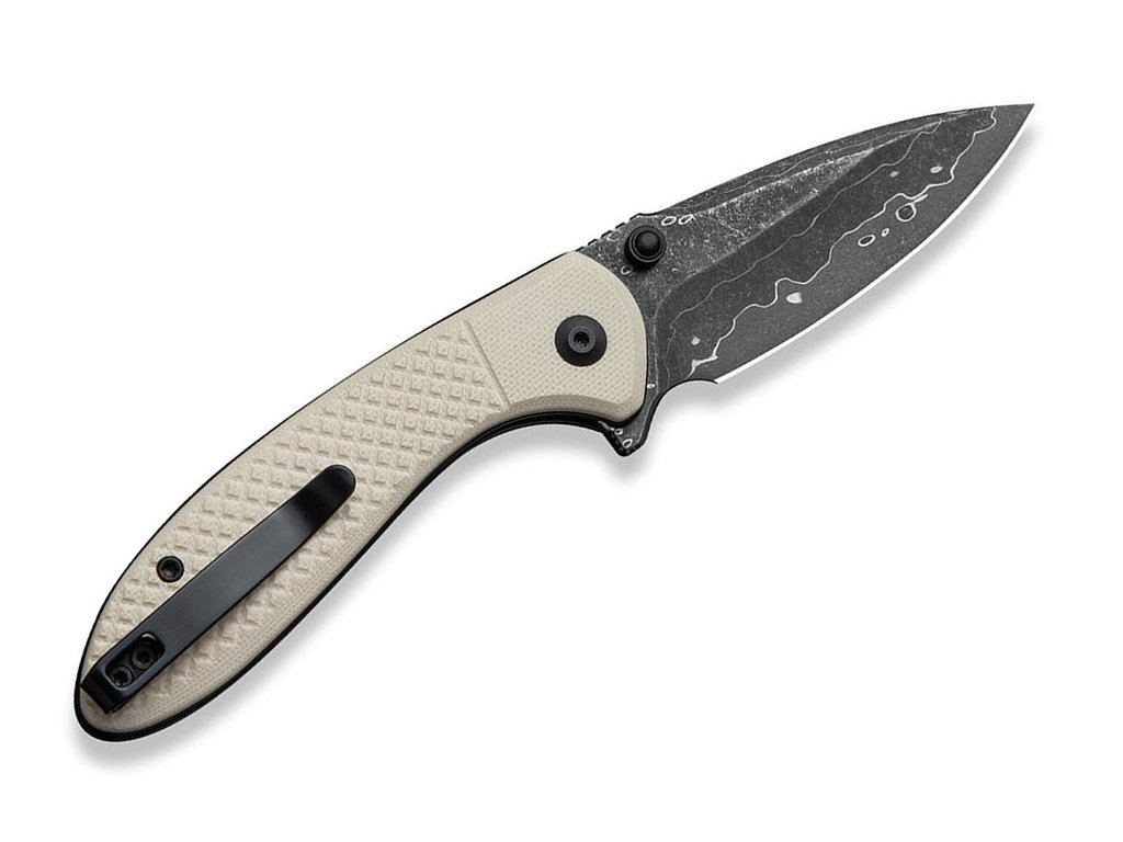 Cuțit pliabil ușor. Lamă din oțel de damasc. Lungimea lamei 7,57 cm, lungime totală 18,4 cm. Mâner din G10 de culoarea fildeșului. Blocare a lamei button lock.