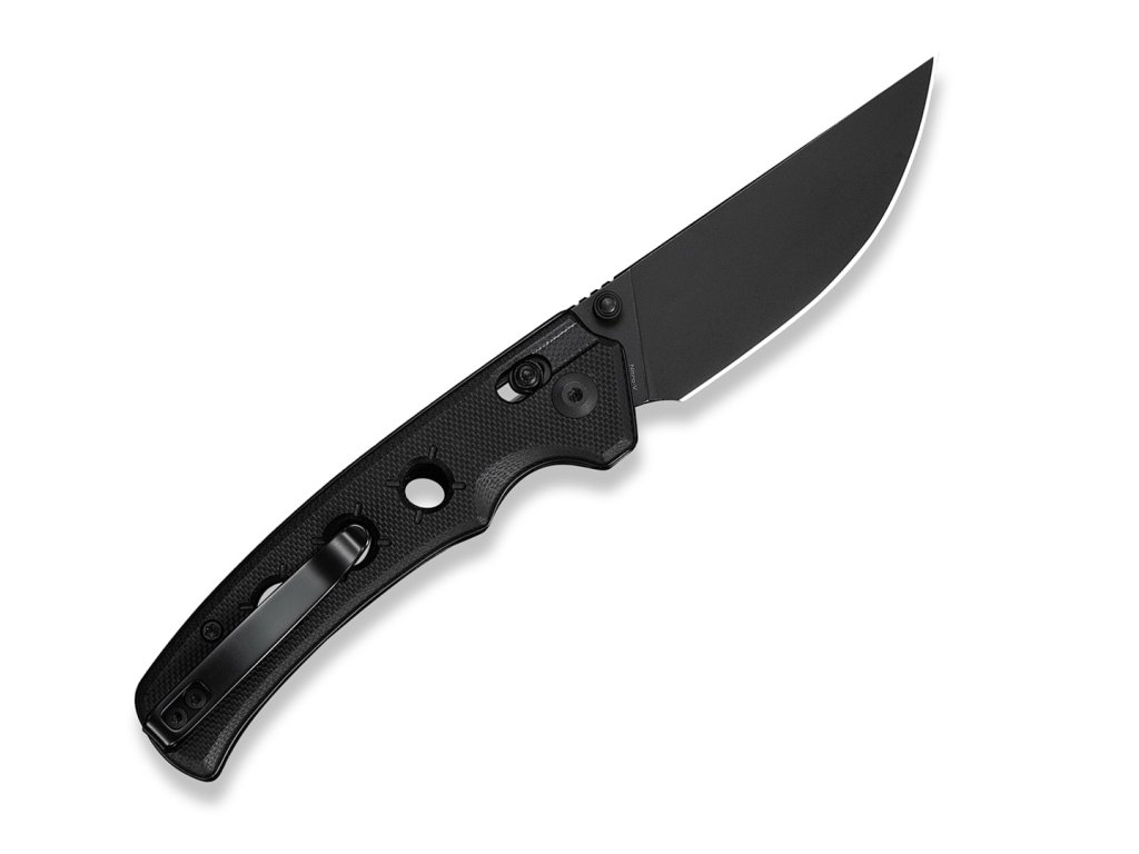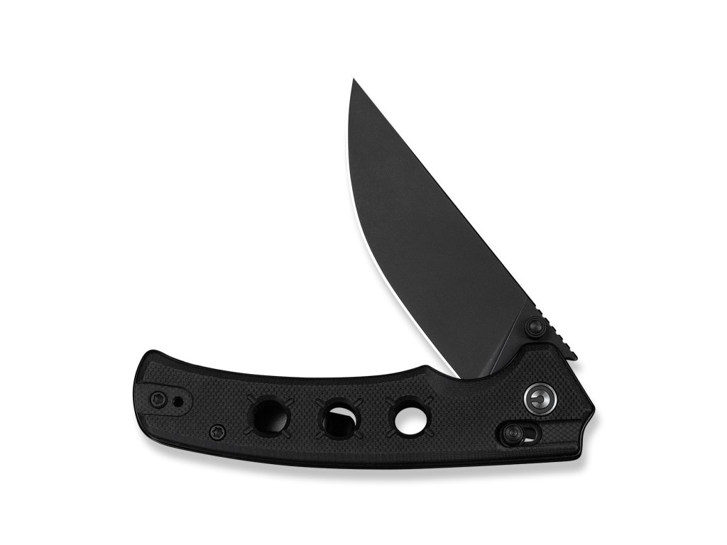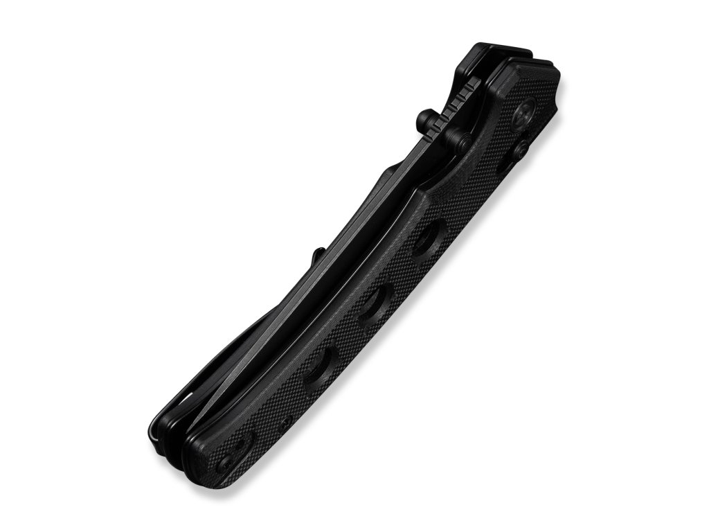 Cuțit de buzunar mic din oțel inoxidabil Nitro-V. Lamă neagră de lungime 7,57 cm, lungimea totală 18,1 cm. Mâner negru din G10. Blocare a lamei crossbar lock.