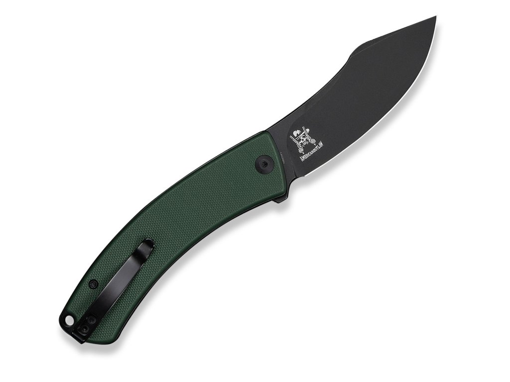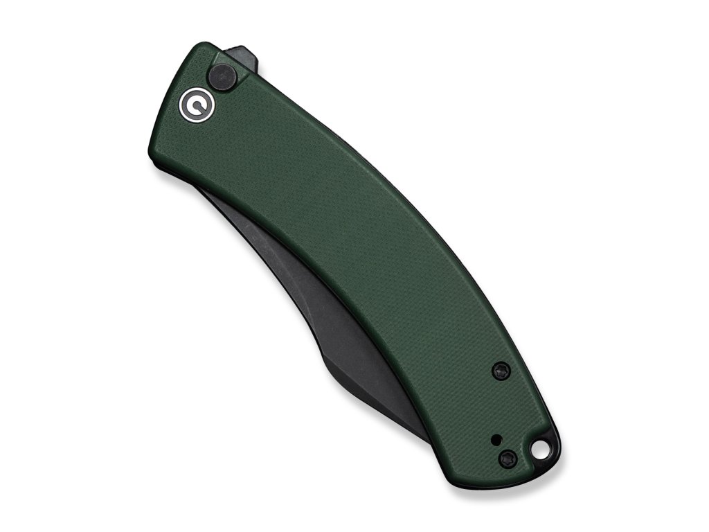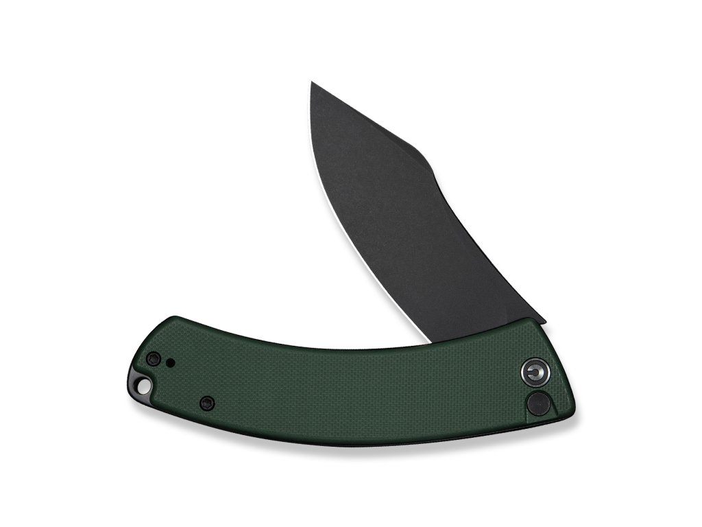 Cuțit de buzunar din oțel inoxidabil 14C28N. Lamă neagră de lungime 8,82 cm, lungime totală 20,5 cm. Mâner verde din G10. Blocare a lamei button lock.