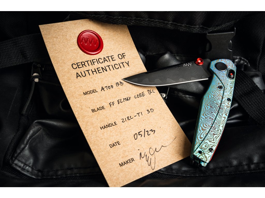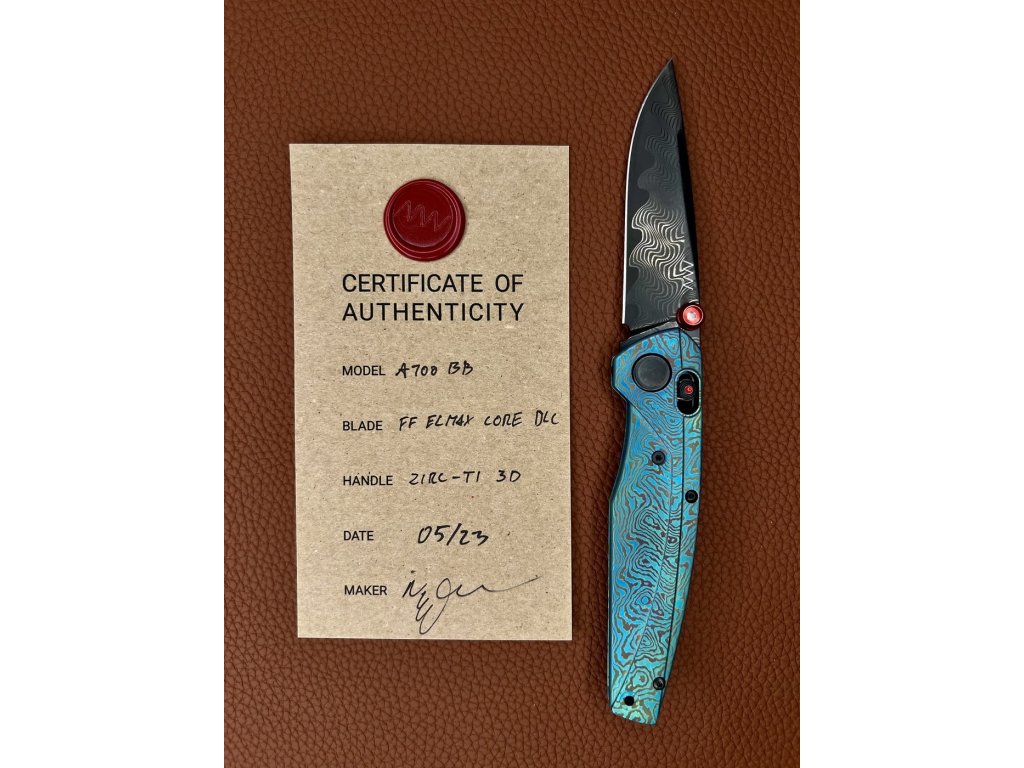 Oțelul este călit la 60 – 61 HRC cu finisaj DLC, care asigură o rezistență mai mare a lamei și, în același timp, previne reflexiile nedorite. Forma lamei drop point cu tăiș tip flat grind asigură proprietăți de tăiere perfecte. Deschidere cu o singură mână cu ajutorul unui știft de pe lamă, care are în centru un punct luminescent. Blocarea lamei A-lock este foarte sigură și confortabilă atât pentru dreptaci, cât și pentru stângaci.