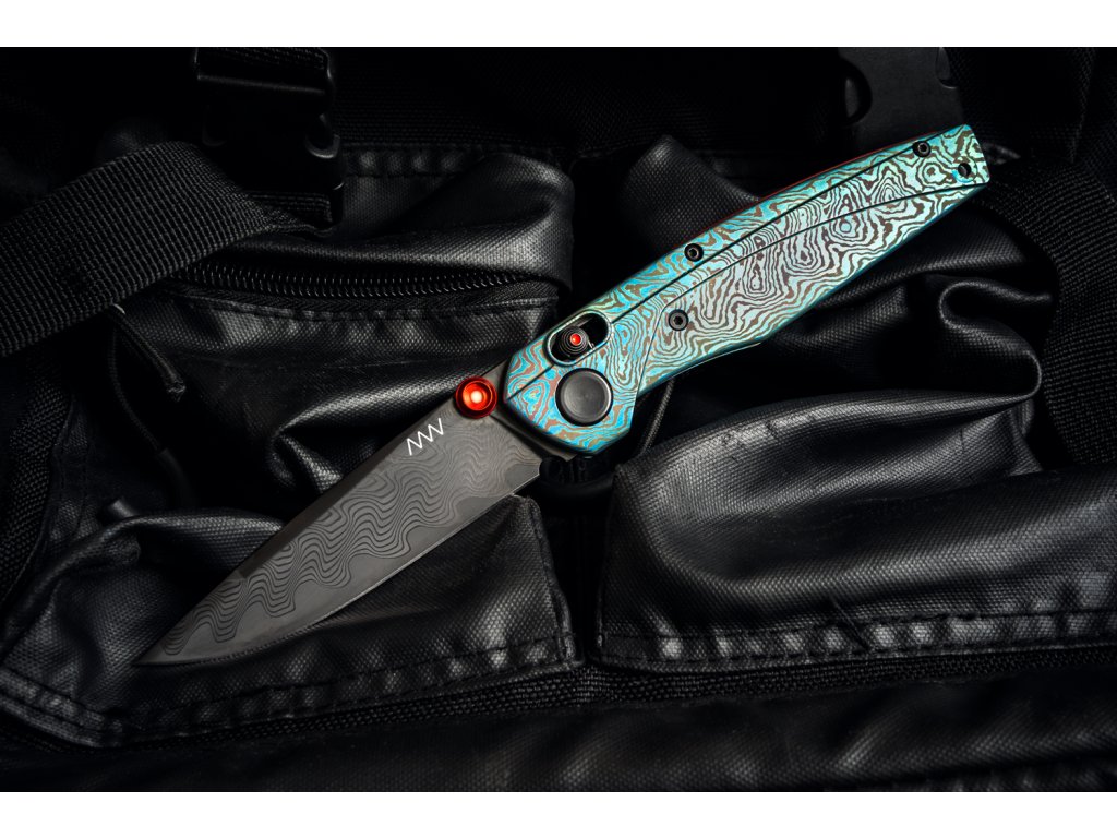 Mânerul impresionant este dintr-un compozit fabricat din mai multe tipuri de titan. Nu se poate confunda cu metalul clasic, deoarece acest compozit are proprietăți mecanice perfecte și este excepțional tocmai prin combinațiile sale bogate de culori. Culoarea turcoaz a mânerului este completată de un model interesant. Culorile variate sunt obținute prin oxidare electrochimică sau termică. Fiecare piesă este unică și diferă ușor de celelalte prin nuanța de culoare. Materialul este foarte ușor, plăcut la atingere și complet hipoalergenic. Un astfel de compozit este rezistent la coroziune, chiar și în cazul contactului îndelungat cu pielea umană sau după contactul cu acizii obișnuiți.