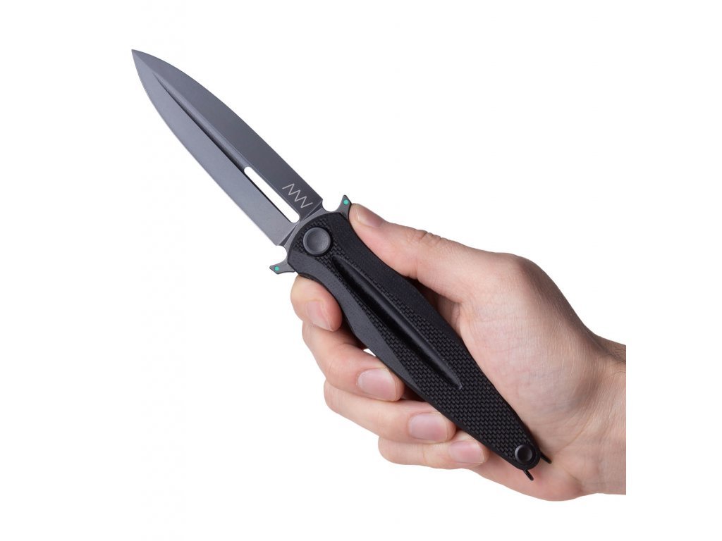 Lama în formă de dagger cu o lungime de 10 cm este fabricată din oțel suedez Sleipner. Are un tăiș fals. Lama este din oțel cu duritate 60 HRC, cu finisaj DLC și este montată pe rulmenți cu bile, care asigură o funcționare lină. Garda lamei este completată de puncte luminescente ANV Lumidot, care sunt realizate din pigment elvețian superluminova de top. Nu veți rata acest detaliu fin nici în condiții de întuneric sau pe timp de noapte.