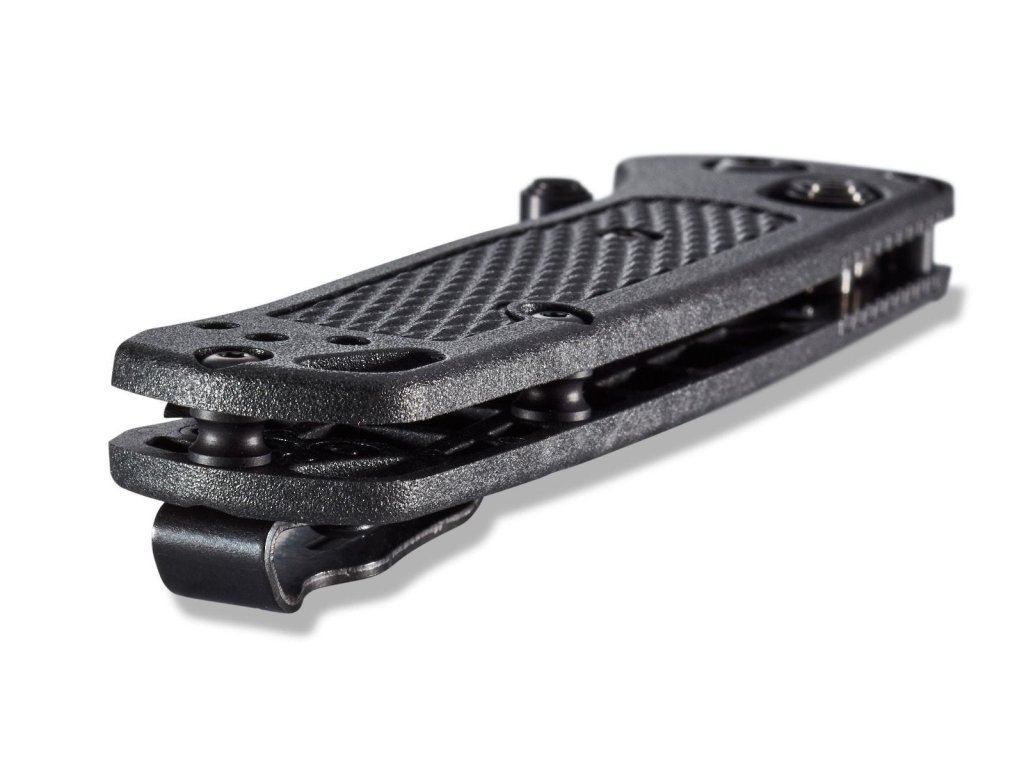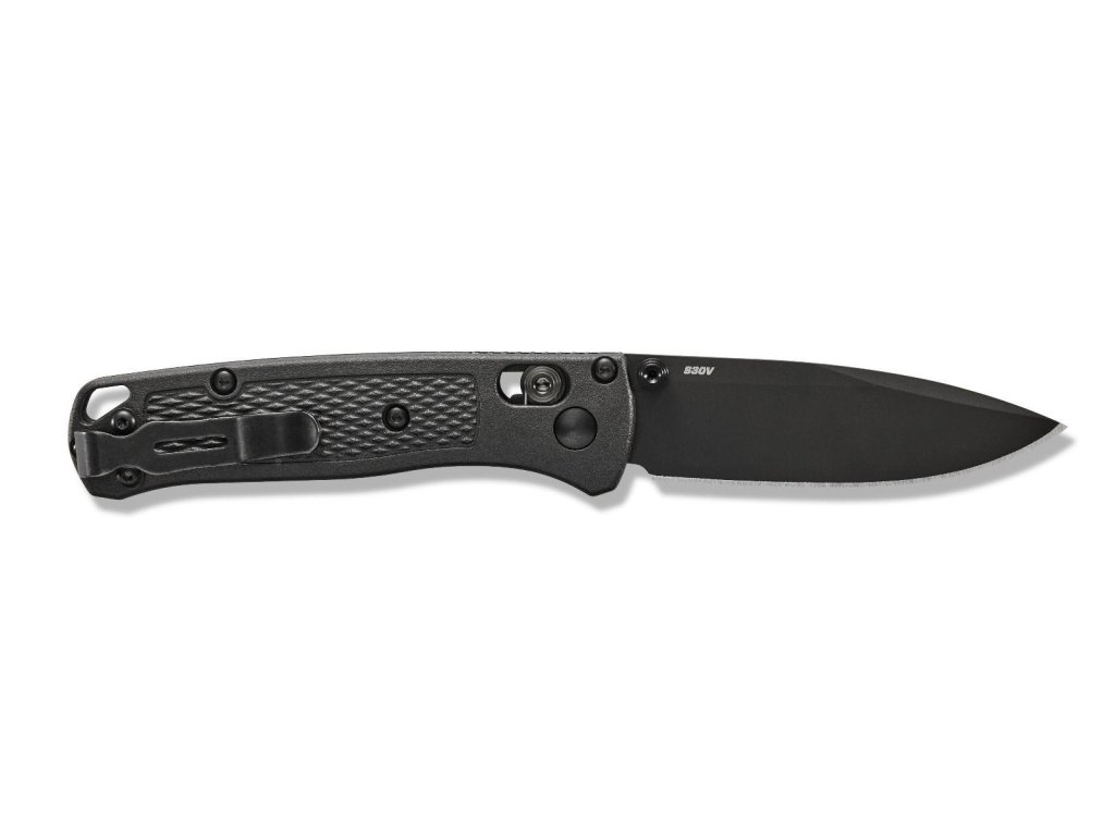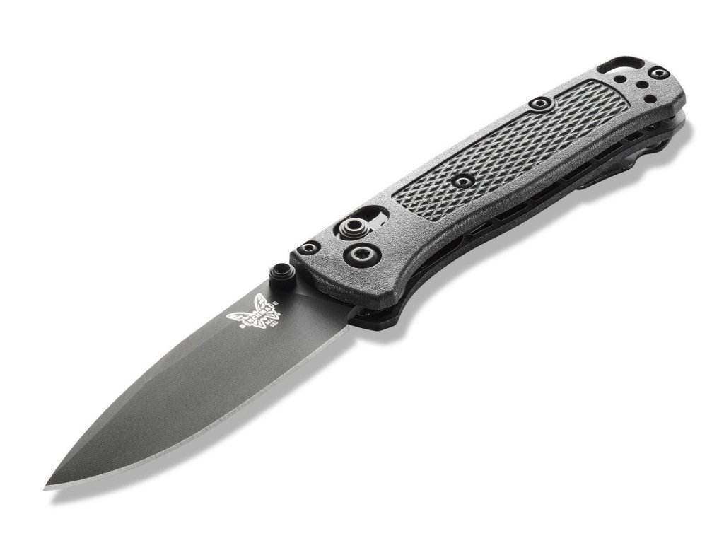 Mini Bugout este o versiune mai mică a popularului model Bugout. Fabricat din aceleași materiale premium ca și fratele său mai mare, este ușor, subțire și ergonomic în același timp. Lama are lungimea de 7,16 cm, este fabricată din oțel inoxidabil premium CPM S30V (duritate 58-60 HRC), are un finisaj DLC negru, tăiș flat grind și formă drop point. Mânerul este fabricat din CF-Elite™(un plastic extrem de rezistent, fabricat prin combinația de polimeri din nylon și fibră de carbon) de culoare neagră. Cuțitul are un clips pentru agățare care se poate fixa pe ambele părți. Cuțitul este, prin urmare, potrivit atât pentru utilizatorii dreptaci, cât și pentru stângaci. Tip de blocare a lame Axis Lock, are un orificiul pentru șnur - lanyard hole. Deschidere cu o singură mână prin intermediul unui știft pe lamă. Cuțitul este fabricat în SUA.