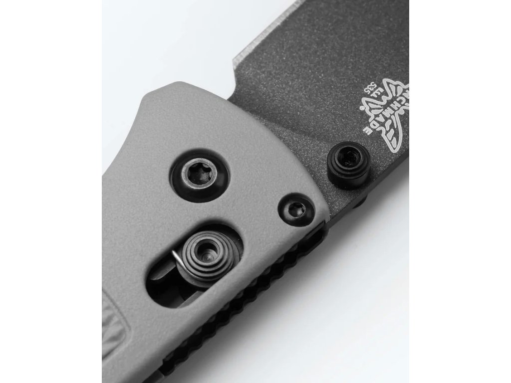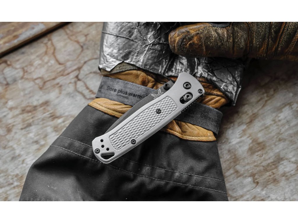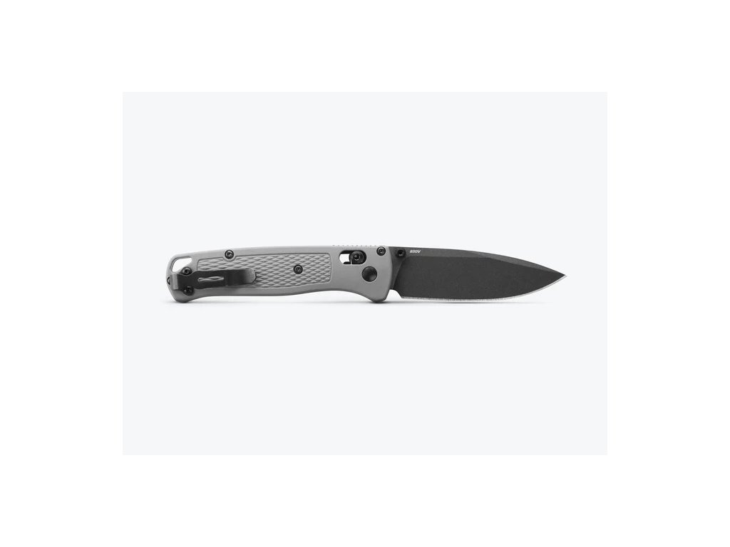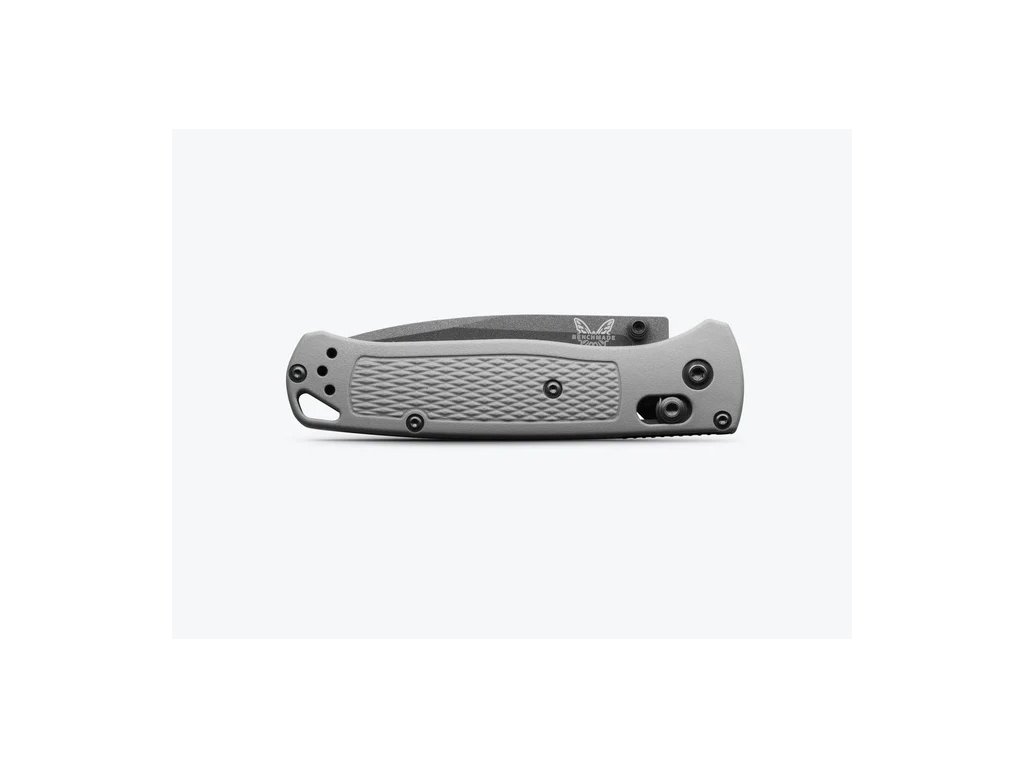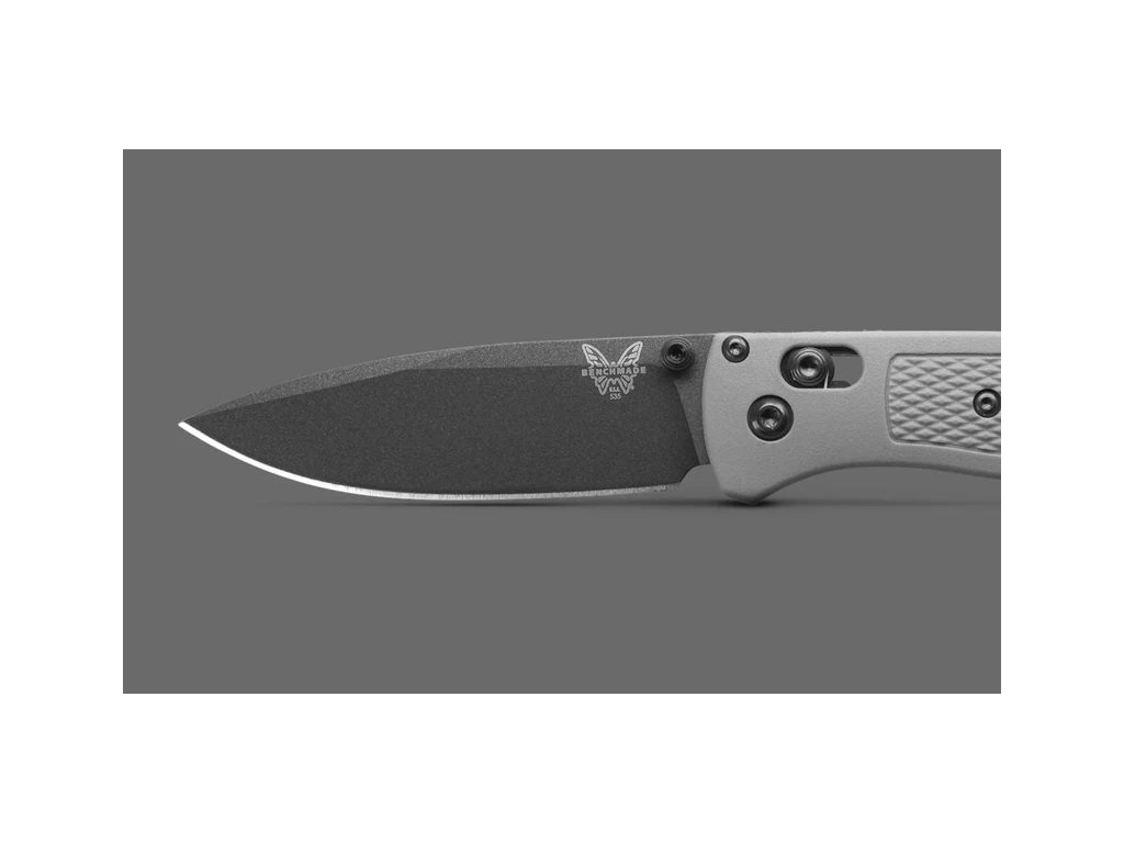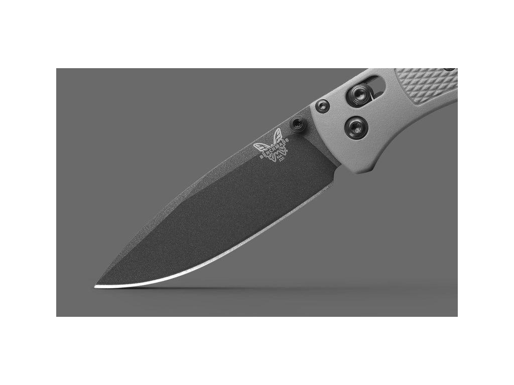 Benchmade Bugout este de mult timp unul dintre cele mai populare cuțite pliabile EDC (pentru uz zilnic). Este fabricat din materiale premium, ușor, subțire și ergonomic în același timp. Lama de lungime 8,2 cm este fabricată din oțel inoxidabil premium CPM S30V (duritate 58-60 HRC), are un finisaj cerakote negru, tăiș flat grind și formă drop point. Mânerul este fabricat din material plastic Grivory gri. Cuțitul are o clemă reversibilă fiind potrivit atât pentru utilizatorii dreptaci, cât și pentru cei stângaci. Blocare a lamei tip Axis Lock, orificiu pentru șnur. Deschidere cu o singură mână prin intermediul unui știft pe lamă. Cuțitul este fabricat în SUA.
