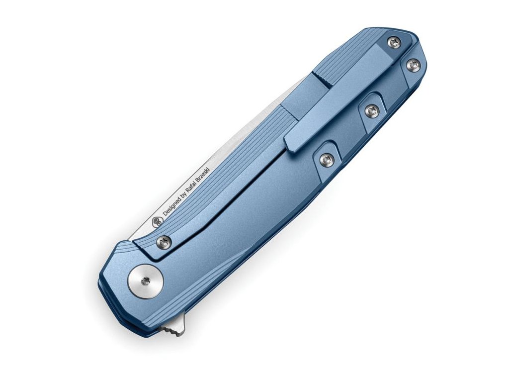 Cuțit premium Bestech 9 Frame Lock Blue BT2408C fabricat din materiale excepționale. Lama wharncliffe cu o lungime de 9,6 cm este fabricată din oțel premium M390, care este considerat unul dintre cele mai bune oțeluri pentru cuțite. Lama are un finisaj stonewash satinat și oțelul are o duritate ridicată de 59-61 HRC. Rulmenții ceramici asigură o operare extrem de lină și ușoară a lamei, la fel cum ne-am obișnuit cu cuțitele Bestech. Mâner realizat din titan albastru. Clema și backspacer-ul sunt, de asemenea, din titan. Deschidere cu o singură mână prin intermediul unui disc de pe mâner. Blocare tip frame lock.. Greutatea lamei este de 121,4 g.