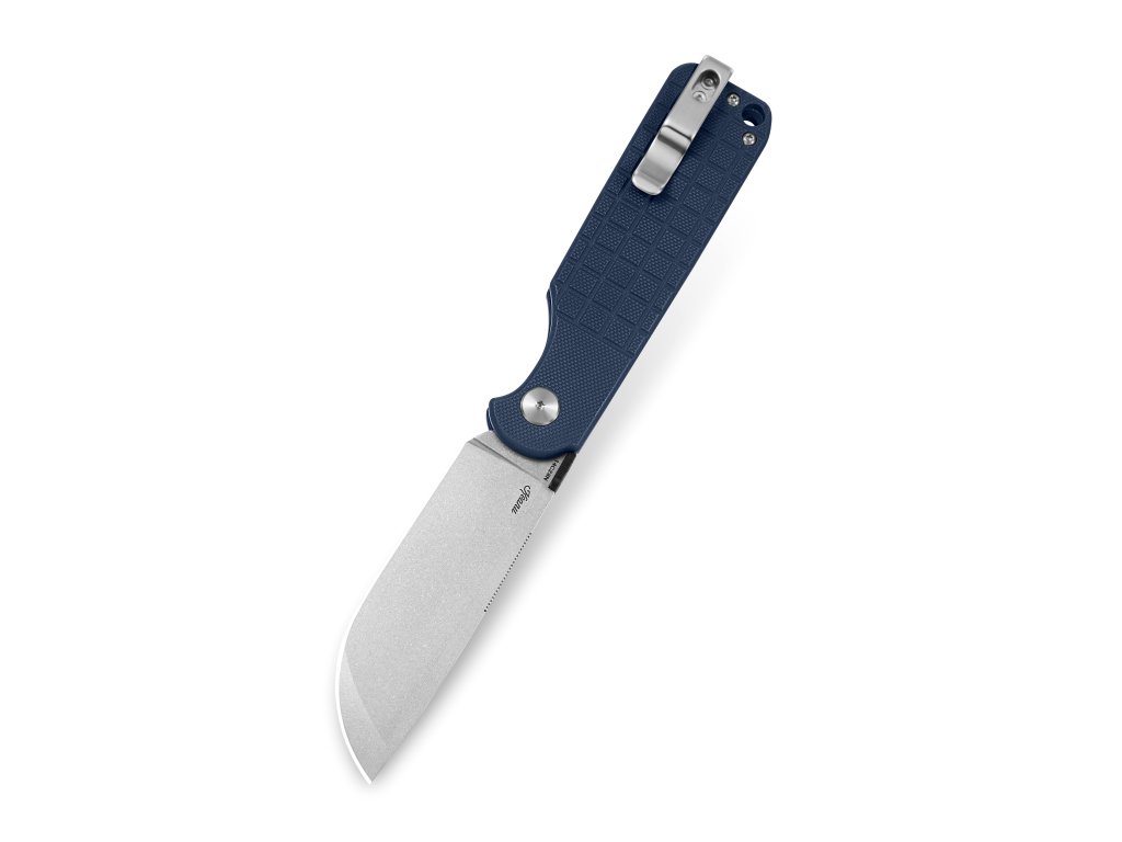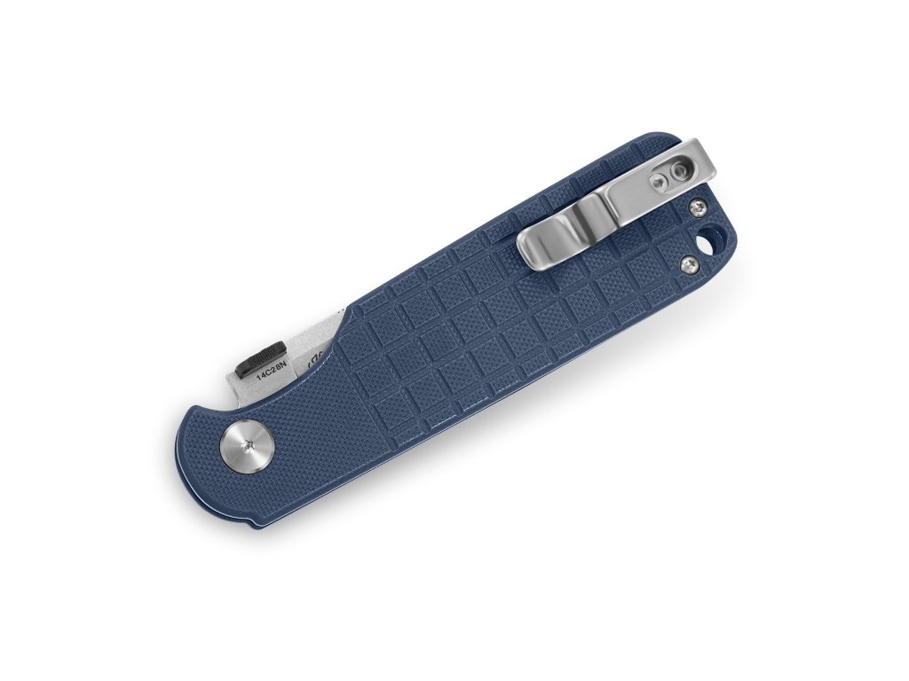 Cuțit pliabil pentru utilizare zilnică, cu blocare a lamei tip button lock. Lama este fabricată din oțel inoxidabil 14C28N, cu tăiș flat grind, are o lungime de 9 cm și este montată pe rulmenți ceramici. Lama are un finisaj stonewash. Mâner din G10 gri, cu textură pentru o prindere mai fermă. Cuțitul are o clemă din oțel care permite agățarea. Deschidere cu o singură mână cu un disc pe lamă.