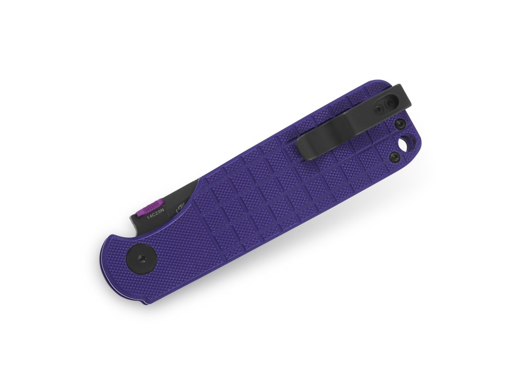 Cuțit pliabil pentru utilizare zilnică, cu blocare a lamei tip button lock. Lama este fabricată din oțel inoxidabil 14C28N, cu tăiș flat grind, are o lungime de 9 cm și este montată pe rulmenți ceramici. Lama are un finisaj stonewash. Mâner din G10 mov cu textură pentru o prindere mai fermă. Cuțitul are o clemă din oțel care permite agățarea. Deschidere cu o singură mână cu un disc pe lamă.