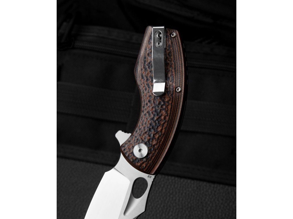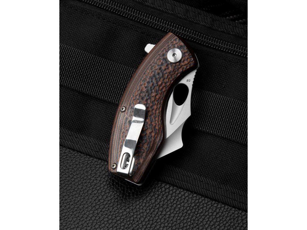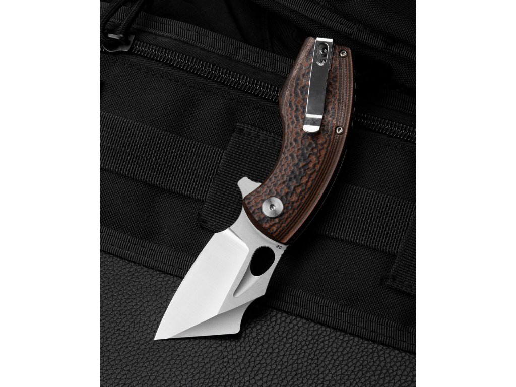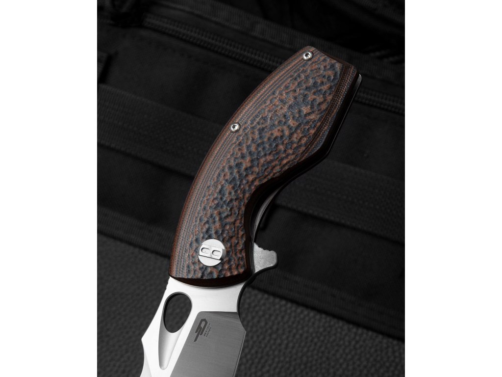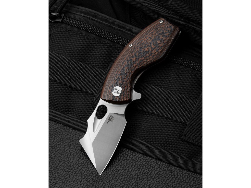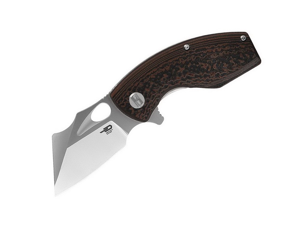 Bestech Lizard este un cuțit pliabil mai mic cu un design original. Lama cu o formă modificată sheepsfoot, din oțel pentru unelte D2, cu tăiș flat grind, are o lungime de 6,1 cm și este montată pe rulmenți ceramici. Mânerul este fabricat din G10 texturat cu finisaj negru-portocaliu. Blocaj tip Liner Lock. Clemă din oțel pentru agățare. Deschidere tip flipper.